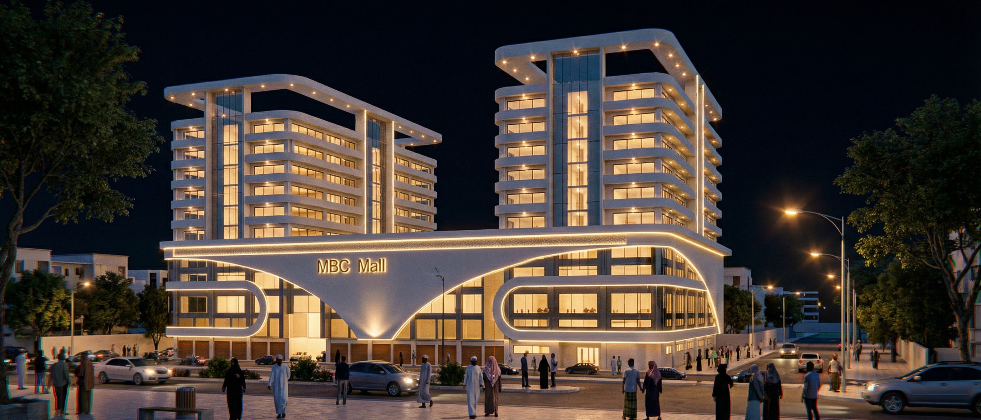 IMAGE SHOWING A MALL WITH GROUND FLOOR AND FOUR COMMERCIAL FLOORS AND TWO TOWERS FROM 5TH TO 1OTH FLOORS. MAKE THE GLASS CLEAR REFLECTIVE AND REALISTIC. TURN ON THE LIGHTS IN THE BUILDING. INCLUDE ROPE LIGHTS, SPOT LIGHTS AND STREET LIGHTS IN THE BUILDING. THE PEOPLE ON THE STREET SHOULD BE OF SOMALI ORIGIN. USE WHITE WALL MASTER ON THE BUILDING. INCLUDE NAME "MBC MALL" ON THE BUILDING. SHOW WHOLE BUILDING AND MAINTAIN ORIGINAL CAMERA ANGLE., keep exact camera angle