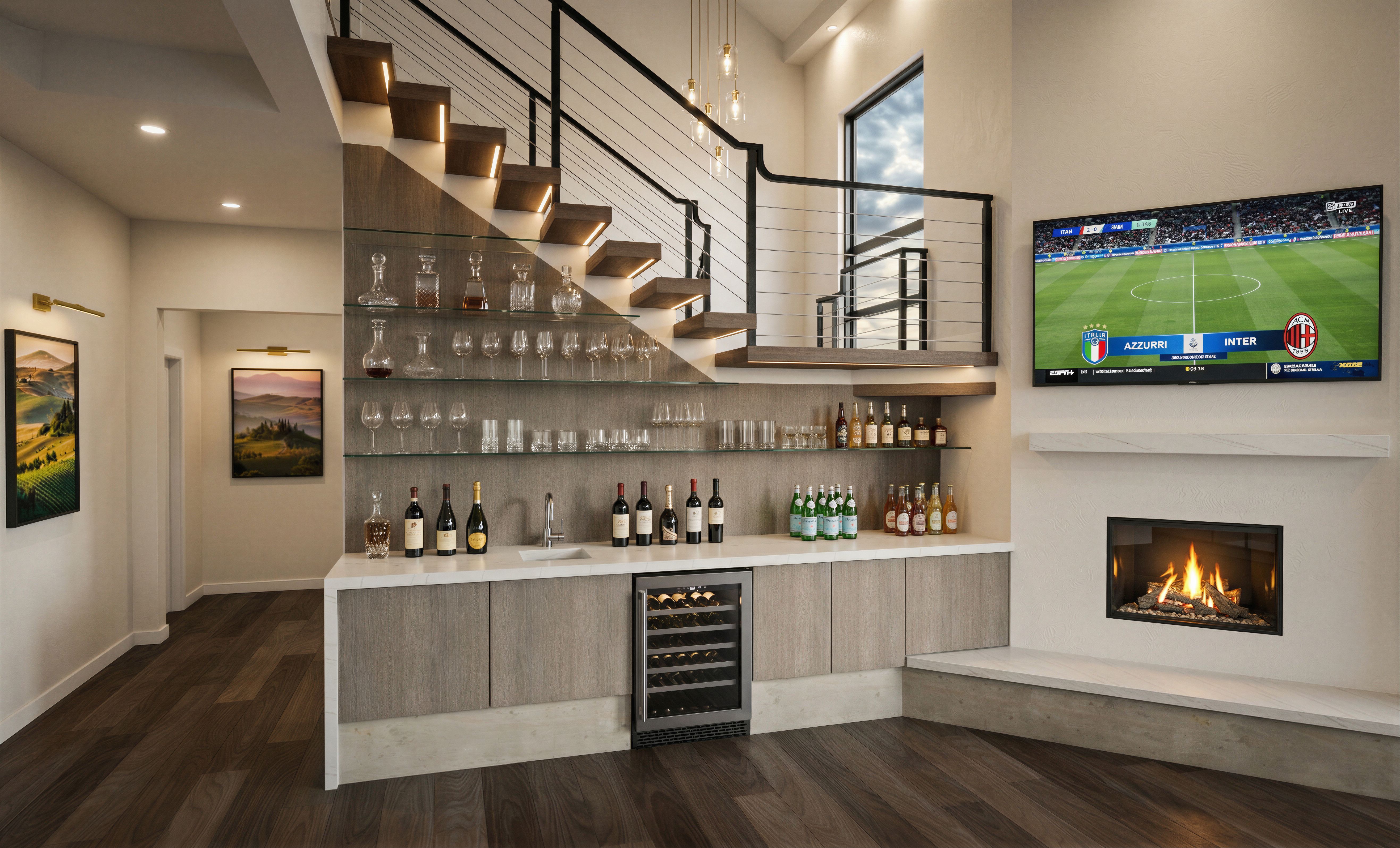 make photorealistic rendering from this image make wet bar under the stairs next to fireplace as indicated wood is light to medium gray alder design it so the fireplace and wet bar are connected Wet bar has glass shelves beverages are combination of nonalcoholic and wine more glassware than bottles fireplace is direct vent gas fireplace, show fireplace on burning, fireplace wall is drywall, mantel color as shown floor as shown, just make it photorealistic railing is black steel TV above the fireplace is showing soccer field with Italian soccer team playing do not add any furnishings outside of wet bar area lights on in the room add lighting under the stair steps add light fixtures where appropriate skies trough the existing stair window do not add windows do not add windows do not add windows keep existing windows do not add doors keep existing doors, keep exact camera angle