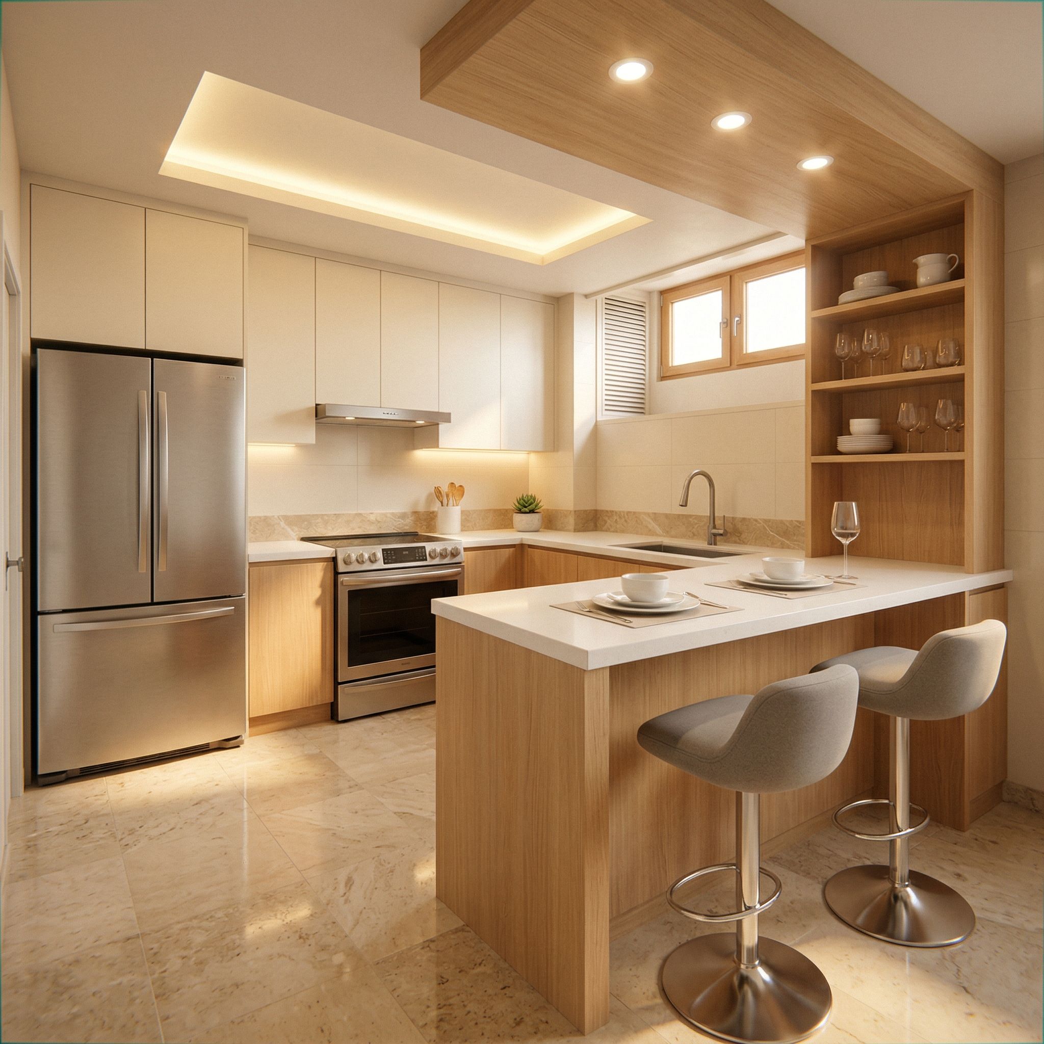 PromptFazer remodelação de cozinha conforme referência, respeitando totalmente o Layout e medidas da foto assim como as janelas pequenas existentes na foto, keep exact camera angle
