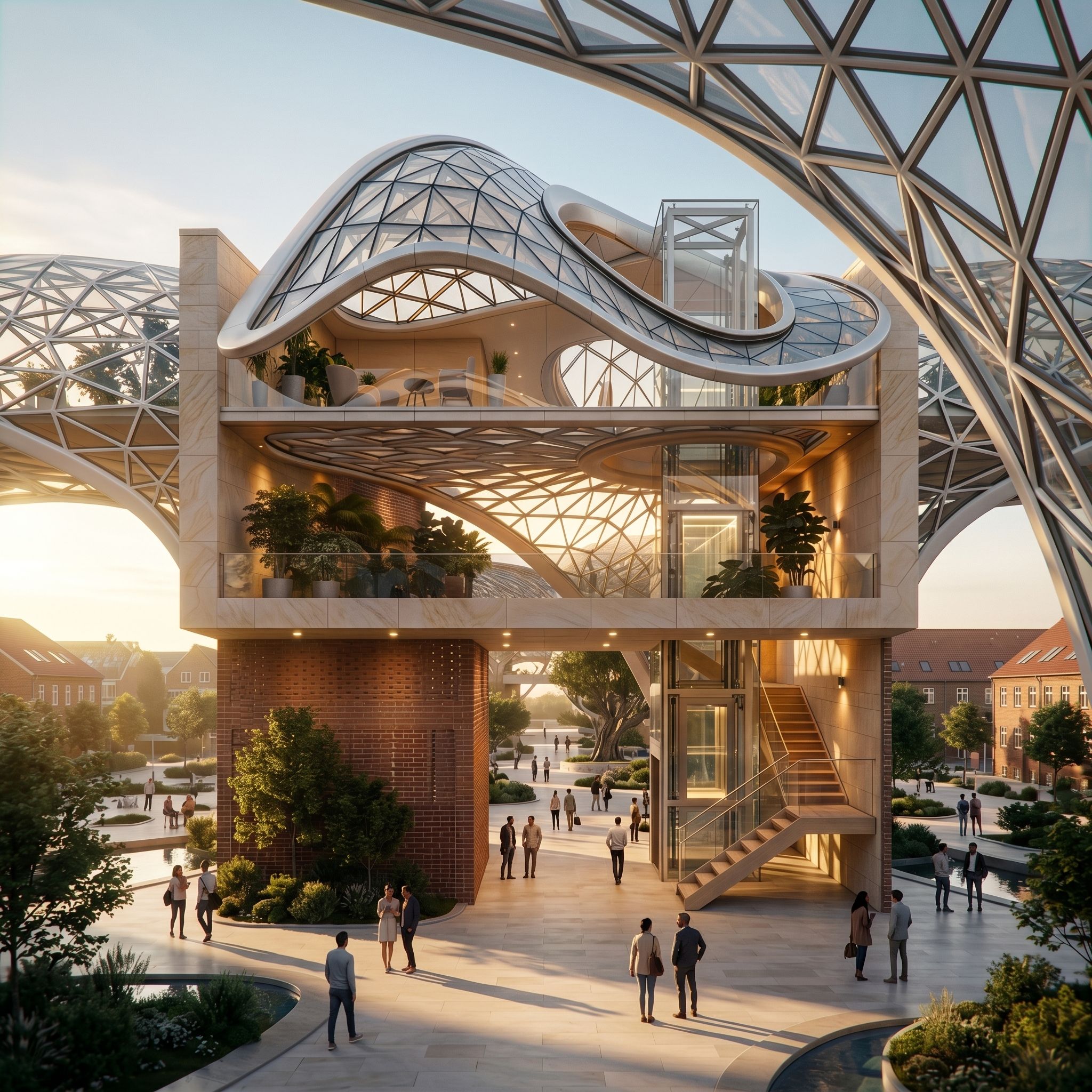 Promptcreate a human-height view, from the viewpoint corresponding to the yellow arrow, looking towards the ergonomic building made of white metal and glass, indicated by the upper yellow arrow. Use a style and color tones of the materials like those of reference image1., keep exact camera angle
