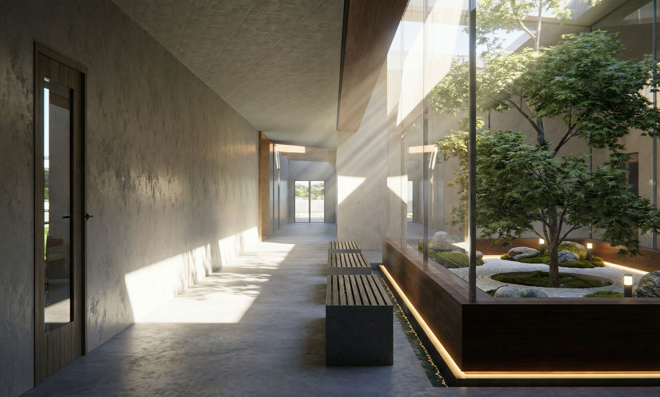 this is a corridor with central courtyard. make it zen courtyard, clean minimalist style yet calming n welcoming. there is a void around the tree as it punctures through the floor. theres lights around the tree/ around the courtyard. there is water rill around the rectangular courtyard. include lights in the water rill. Make into eyelevel height, keep exact camera angle. Add natural sunlight rays, keep exact camera angle