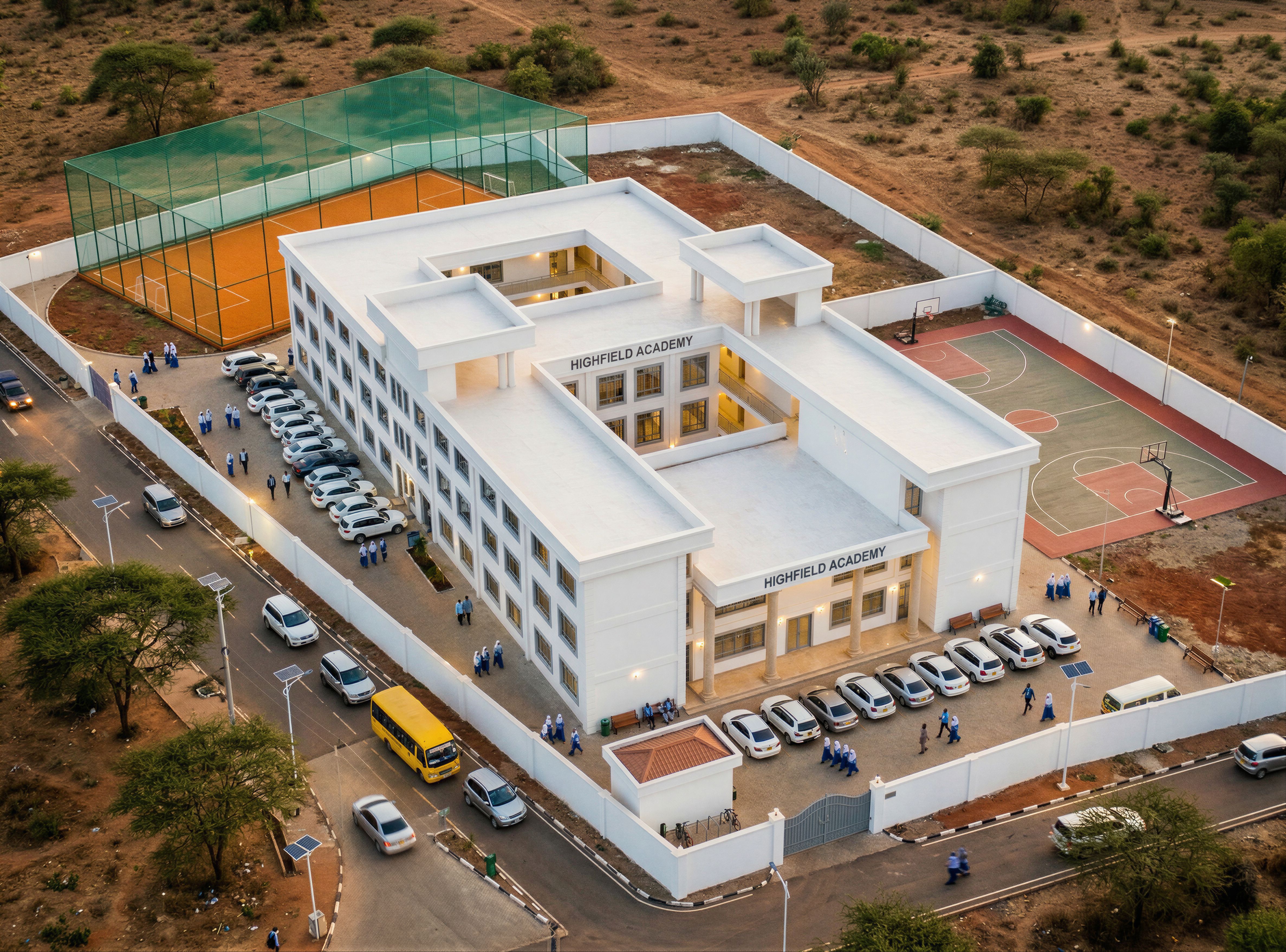 RENDER OF A SCHOOL IN GARRISSA COUNTY IN KENYA. MAKE THE GLASS REALISTIC AND REFLECTIVE. INCLUDE MOULDINGS ON OPENINGS AND WINDOWS. MAKE THE TWO ROUND COLUMNS CLASSICAL IN DESIGN. MAKE THE SURROUNDING FENCE BE MADE OF MASONARY. INCLUDE STREET LIGHTS AND SPOT LIGHTS IN THE BUILDING. ON THE UPPER SIDE IN ORANGE IS A FOOTBALL PITCH COVERED IN A GREN SPORTS NET ALL ROUND. ON THE RIGHT SIDE IN RED IS A BASKETBALL COURT. INCLUDE CHILDREN OF SOMALI ORIGIN IN SCHOOL UNIFORM. INCLUDE TEACHERS OF AFRICAN AND SOMALI ORIGIN. USE BRILLIANT WHITE WALL MASTER ON BUILDING AND SURROUNDING BOUNDARY WALL. THE NAME AT THE FRONT ON THE BUILDING SHOULD BE "HIGHFIELD ACADEMY" THE BASKET BALL SHOULD BE WITHIN THE ORIGINAL BOUNDARY IN THE SPACE MARKED IN RED. MAKE GATE AND WINDOW MULLIONS GREY., keep exact camera angle