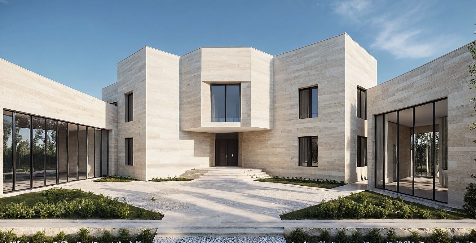 PromptMODERN VILLA , TRAVERTINE MARBLE WALLS , TRAVERTINE MARBLE GROUND , Trees and plants