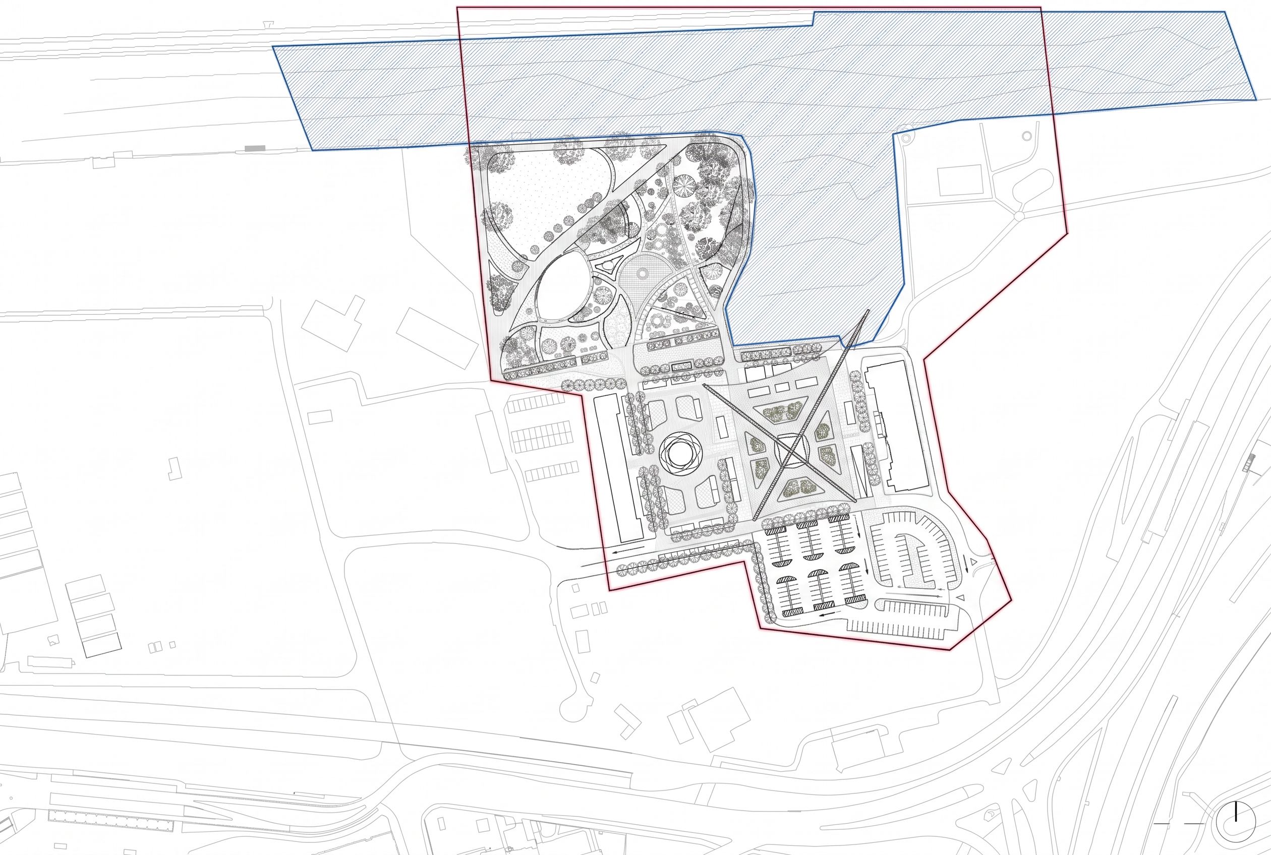 Refine the provided architectural site plan with a strong focus on hierarchy, clarity, and spatial logic. Intervene only within the red-marked area; do not modify anything outside it. The blue-marked areas represent water and must remain unchanged in shape. Preserve all buildings exactly as they are. The main building approx. 55 × 60 m must remain the primary visual accent — draw it with the strongest lineweight and highest clarity. All other elements, including interventions, should be slightly lighter to support the dominance of the building. Redesign the outdoor marketplace next to the building between the main building and the adjacent building on the right so that it is more coherent, connected, and logically integrated into the overall circulation. Create a clear system of paths that naturally link the market, the building entrance, surrounding spaces, and the wider site. The central sculpture should remain but be better positioned as a meaningful focal point within a well-organized layout. Redesign the park along the water so it is more refined and spatially intentional. It should follow the exact water edge, include a clear promenade, greenery, and paths, and feel like a calm, well-designed public waterfront space. Keep the parking area unchanged in size and layout, only add clear access roads and pedestrian connections. Apply a clean AutoCAD-style graphic on a white background: precise black/grey linework, minimalistic, with strong lineweight hierarchy. Use subtle hatching for the water surface following the blue-marked area to distinguish it clearly. Emphasize the main building the most, keep interventions slightly lighter, and render the rest of the context very light and subdued. No text or labels. so do that., keep exact camera angle
