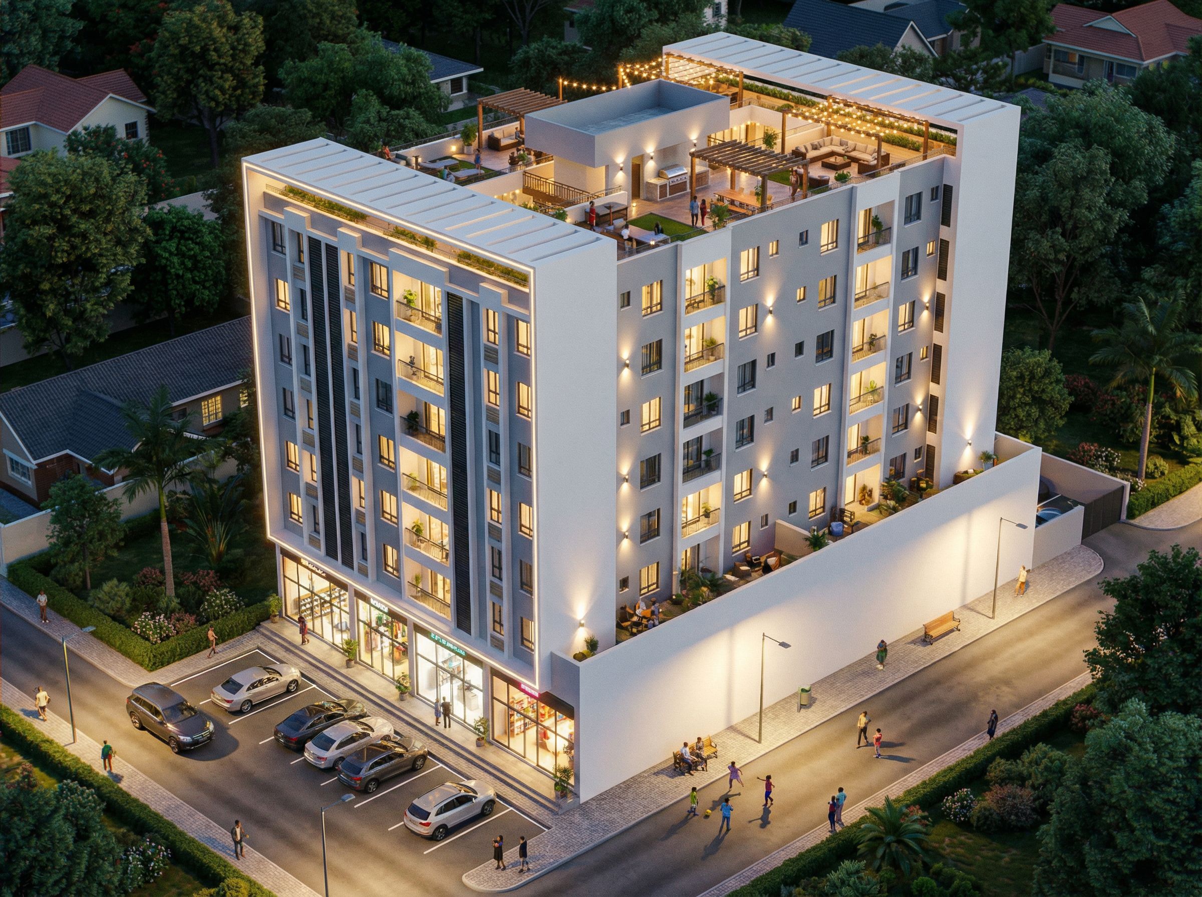 PromptRender in a residential suburb. MAKE GLASS CLEAR, REALISTIC AND REFLECTIVE. PUT SHOPS ON GROUND FLOOR WITH PARKING INFRONT OF IT. USE PEARL WHITE WALL MASTER ON THE BUILDING. HAVE PEOPLE OF AFRICAN ORIGIN AND KIDS PLAYING IN THE FOREGROUND. INCLUDE SOME SPOT LIGHTS, ROPE LIGHTS AND STREET LIGHTS IN THE BUILDING. USE A MIX OF BRILLIANT WHITE AND PASTEL GREY IN THE BUILDING. TURN ON THE LIGHTS. shops at the front only. Write name "KIFARU HEIGHTS" ON THE BUILDING. MAKE IMAGE HIGH RESOLUTION 8K. PUT SHOPS ONLY ON NARROW FACE OF THE BUILDING AND MAKE LONGER SIDE SOLID WALL ON GROUND FLOOR. REMOVE PARKING ON LONGER SIDE. INCLUDE BARBECUE, RECREATIONAL AND SITTING AREA ON THE ROOFTOP., keep exact camera angle