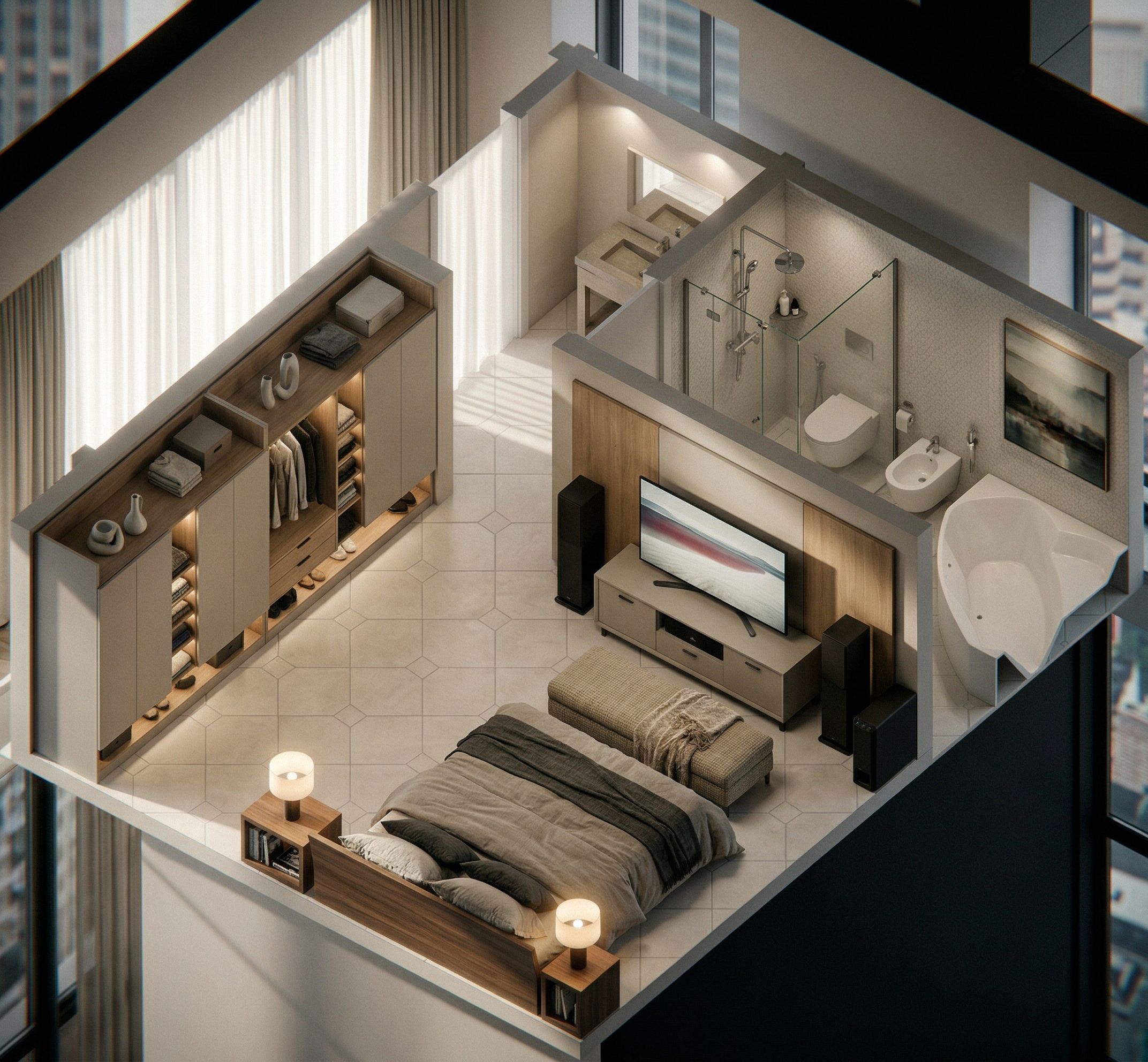 PromptPhoto of a modern Master bedroom interior, showcasing minimalistic furniture and smart space utilization. Focus on the textures of the walls and floor tiles, with a cozy bed and sleek storage cabinets. Set in an urban environment, with soft natural light filtering through windows, casting gentle shadows. Captured from a slightly elevated angle, using a wide-angle lens to emphasize the spatial arrangement and create a sense of openness., keep exact camera angle