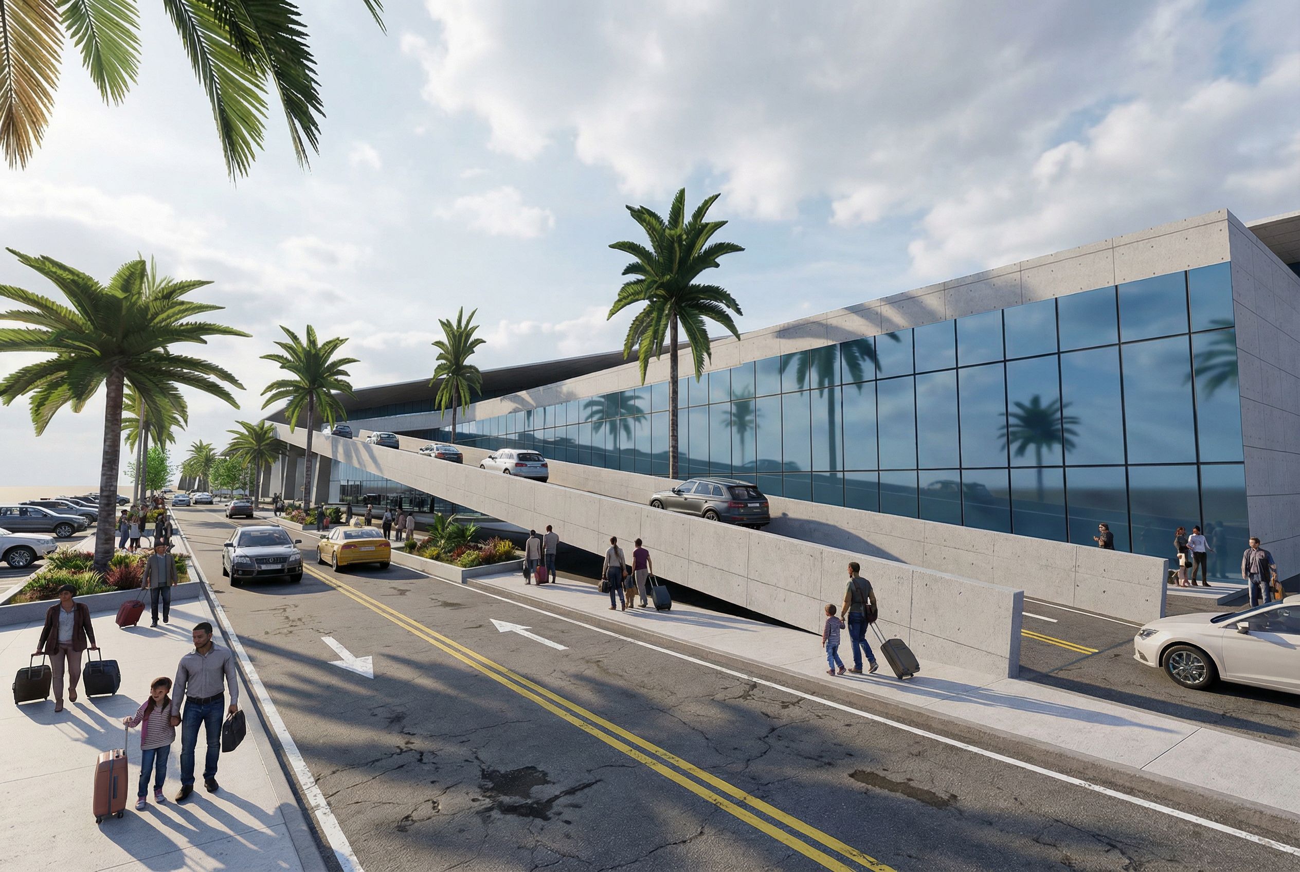 architectural exterior rendering, render this 3D mass into photorealistic rendering, Enhance this airport exterior scene while preserving the architectural design, ramp geometry, façade layout and palm-tree rhythm. Add realistic white road markings and asphalt stripes: lane dividers, edge lines and turning guides, all aligned with the existing street geometry. Improve the asphalt texture with depth and subtle variation. Add cars driving up the elevated ramp and vehicles parked or stopping along the passenger drop-off area. Populate the sidewalks with travelers carrying luggage, families arriving, people walking or waiting for transportation — all realistically scaled and integrated with shadows and lighting. Improve material realism: reflective blue glass façade, detailed concrete ramp texture, natural palm trees with variation in leaves and trunks, realistic planter soil and landscaping. Add soft daylight, dynamic shadows, and atmospheric depth for realism. Ultra-realistic 4K quality, photorealistic lighting, crisp reflections, detailed textures, clean airport aesthetic with vibrant but professional look. no distorted people, no cartoon style, no incorrect scale, no crooked road markings, no unrealistic cars, no clutter, no overexposed light, no fantasy elements., keep exact camera angle, including people, vehicles, trees, high quality, professional, detailed scene