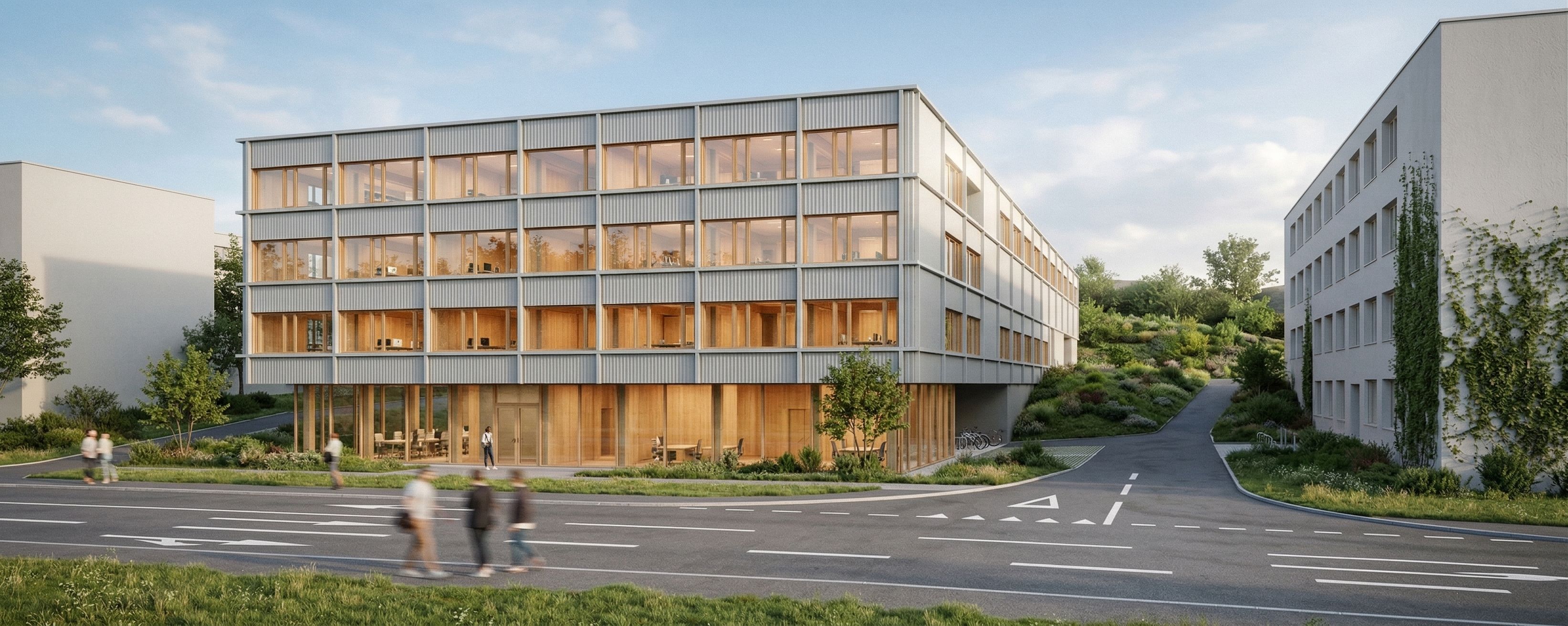 Erstelle eine hochwertige Architekturvisualisierung. Behalte dabei unbedingt die Geometrie und Perspektive aus dem importierten Bild bei. Die horizontalen und vertikalen Lisenen sollen aus mattem hellgrauen Metall sein, die zwischenräume mit hellgrauen Trapezblech. Fenster in Holz. der innenbereich soll warm erscheinen mit viel holzbau und büro. Achte darauf dass die Freiraumgestaltung sich genau an das importierte Bild hält. die grauen Bereiche sollen Straße werden, die grün dargestellen bereiche sollen mit niedrigem gras bepflanzt werden. Wiese auf der Straße im Vordergrund soll straßenmarkierungen hinzugefügt werden, im hintergrund ist eine begrünte böschung zu sehen
