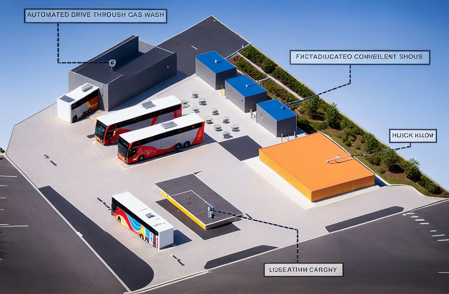 PromptPhoto of a modern gas station complex featuring an automated drive-through car wash and prefabricated convenience shops. Highlight the sleek, functional design with glossy materials and vibrant colors. Set in an urban landscape with visible bus lanes and seating areas, surrounded by lush greenery. The scene is bathed in warm, afternoon sunlight, creating dynamic shadows across the paving. Capture a low-angle view to emphasize the height of structures, using a wide-angle lens to include the broader context of the area.
