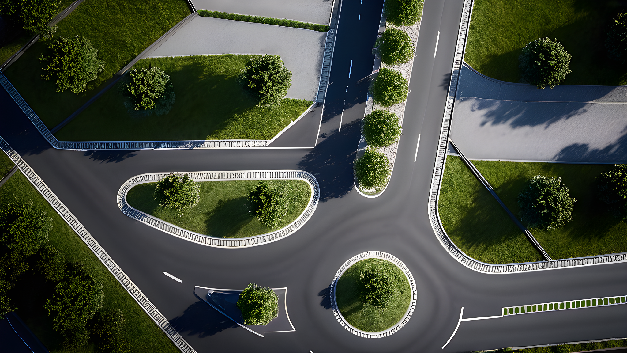 Dark grey car roads. Light grey sidewalks.