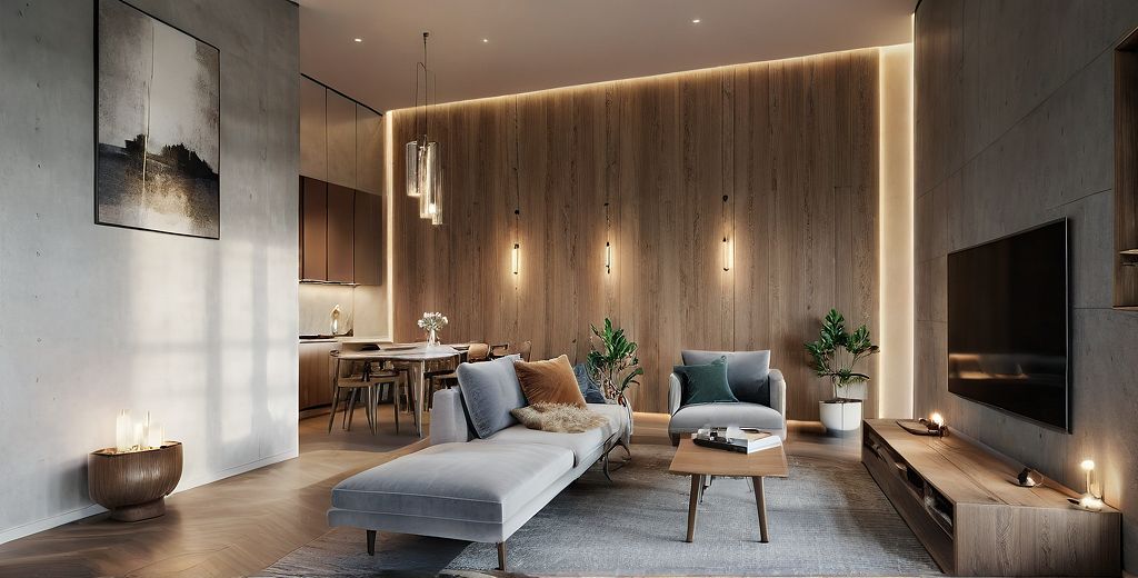 PromptPhoto of a modern living room featuring a sleek, minimalist design with elegant furniture pieces. Warm light wooden wall panels contrast with the light gray sofa and textured area rug, creating a cozy atmosphere. A pendant light hangs from the ceiling, casting soft illumination across the space. A dining area is visible in the background, enhancing the open layout. Captured from a wide-angle perspective to emphasize depth, with natural light filtering in front, highlighting the textures and materials of the furnishings, evoking a lifelike and inviting scene.