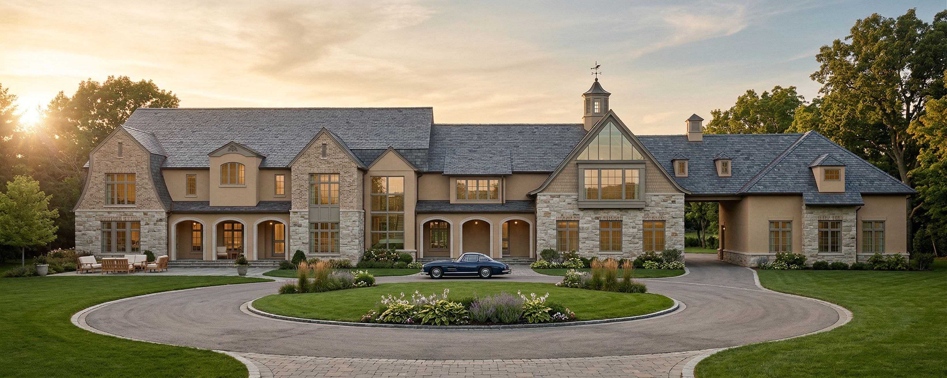 Photo of an elegant residential estate featuring a mix of contemporary and traditional design elements. Focus on the intricate façade with varied textures, including stone, brick, and smooth stucco. Nestled in a landscaped area, the round driveway enhances the grandeur. Natural light casts soft shadows, capturing the time of day just before sunset. Perspective from a low angle, using a wide lens to highlight the height and detail of the structure, while framing the surrounding greenery and subtle architectural accents., keep exact camera angle, keep exact camera angle, keep exact camera angle