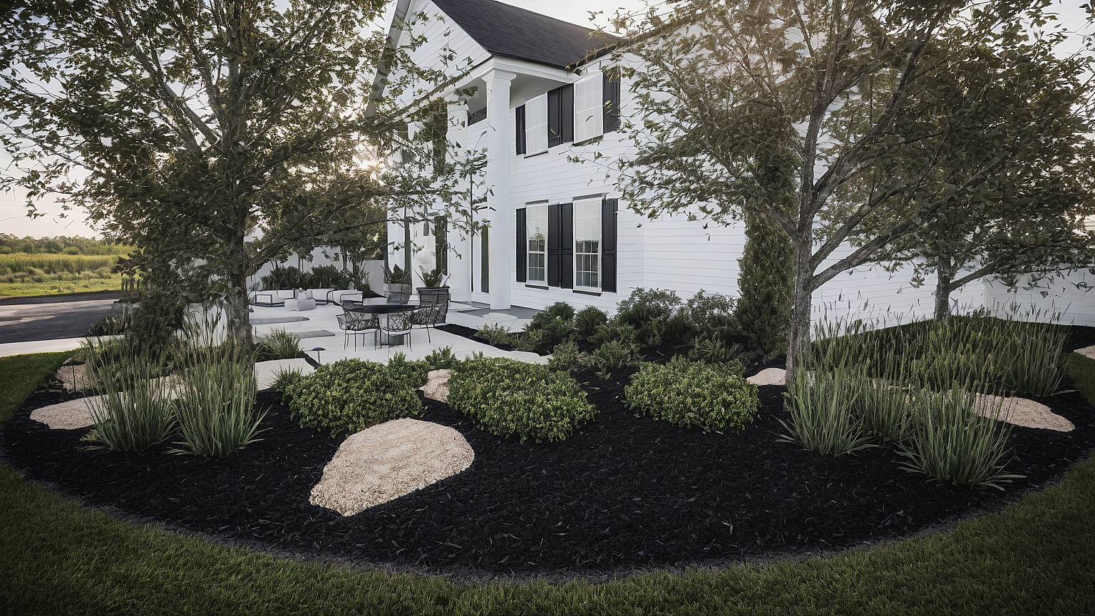 landscaping, black mulch, white siding