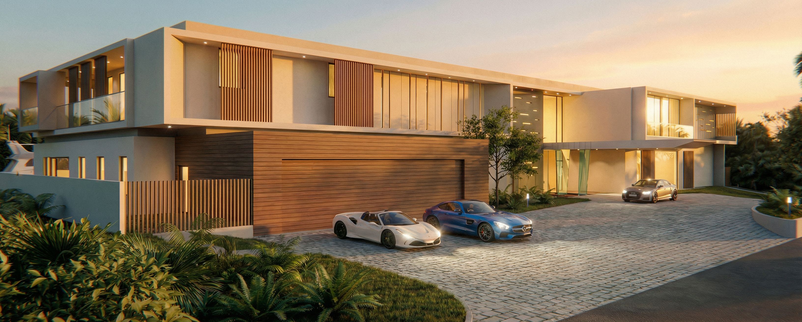 agregar un mercedes benz color azul metalico al lado del ferrari blanco. conservar el ferrari blanco y el audio. no cambiar nada mas en la imagen, keep exact camera angle