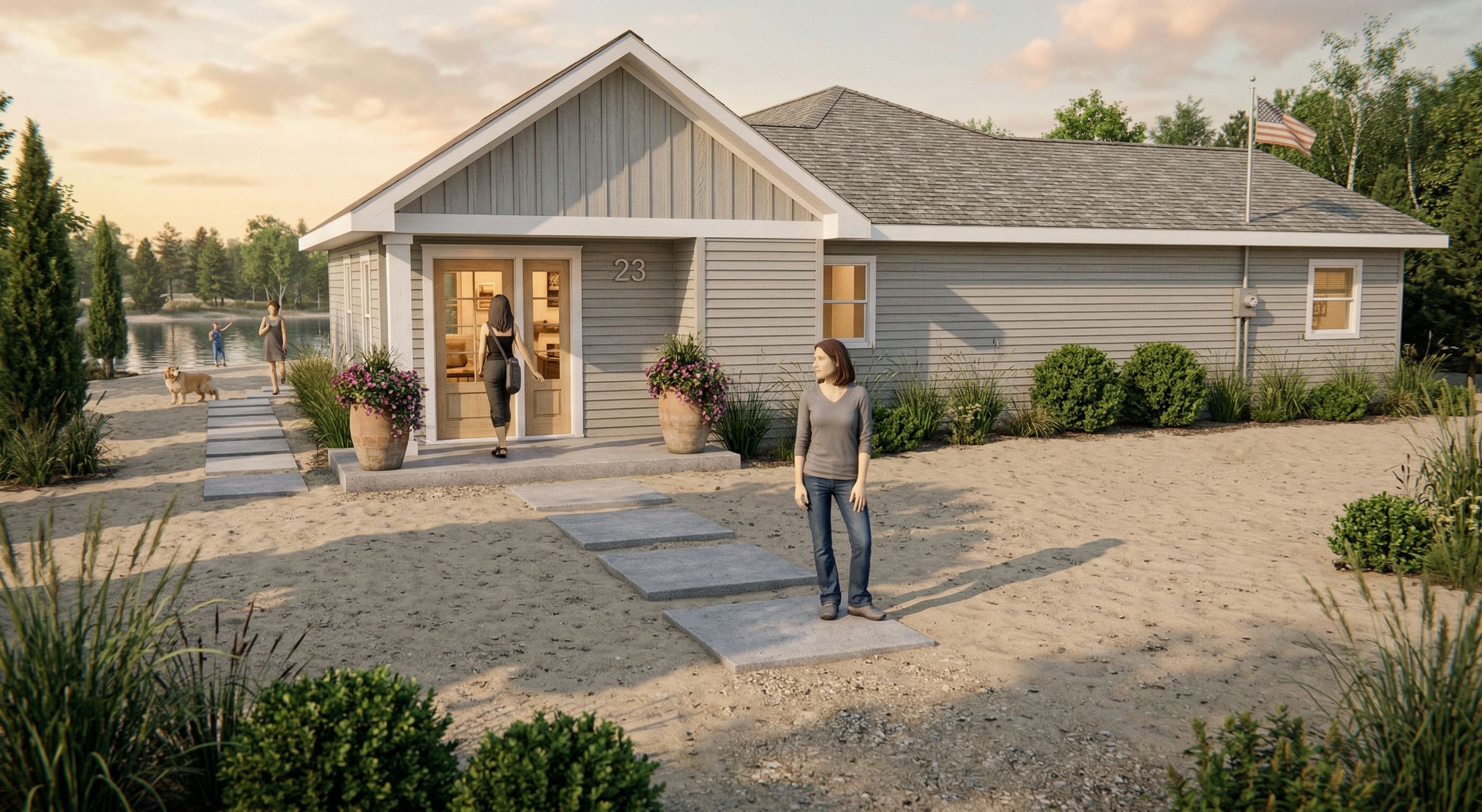 PromptPhoto of a contemporary lakeside beach home single-family home, highlighting stylish architectural details including a gabled roof, light gray lap siding, and white trim glass windows. Surrounding the house, a sand yard features colorful flower pots and neatly arranged plants. In the background, a serene lake adds to the tranquil setting. Soft, natural lighting enhances the scene, casting gentle shadows as the sun sets. Captured from a slightly elevated angle to emphasize the entrance and front pathway, using a wide-angle lens to provide a comprehensive view of the inviting outdoor space., keep exact camera angle