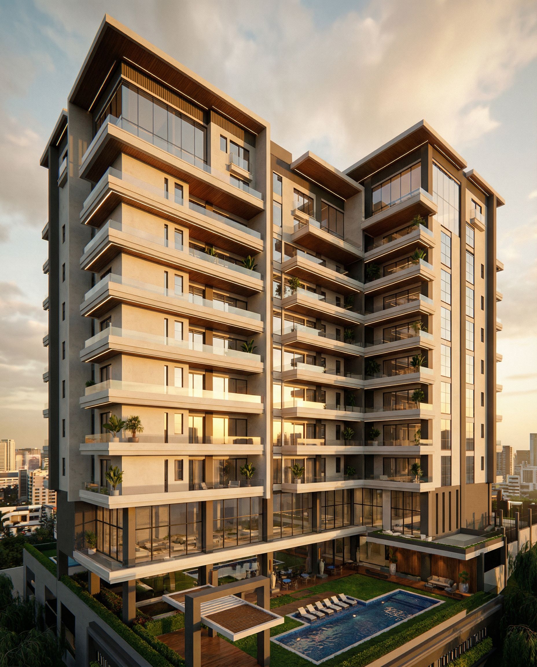 PromptPhoto of a contemporary multi-family residential building featuring expansive glass windows and sleek balconies. Emphasize the smooth concrete facade with horizontal lines, contrasting with warm wood accents. The surrounding urban landscape includes lush green spaces and swimming pools, creating a serene environment. Capture the golden hour lighting, providing soft shadows and warm highlights across the structure. Use a low-angle perspective to showcase the height and modern design, with a wide-angle lens to convey the spaciousness and context of the development amidst city life. add potted plants and seating on the balconies, enhance the lighting but dont change it. , keep exact camera angle