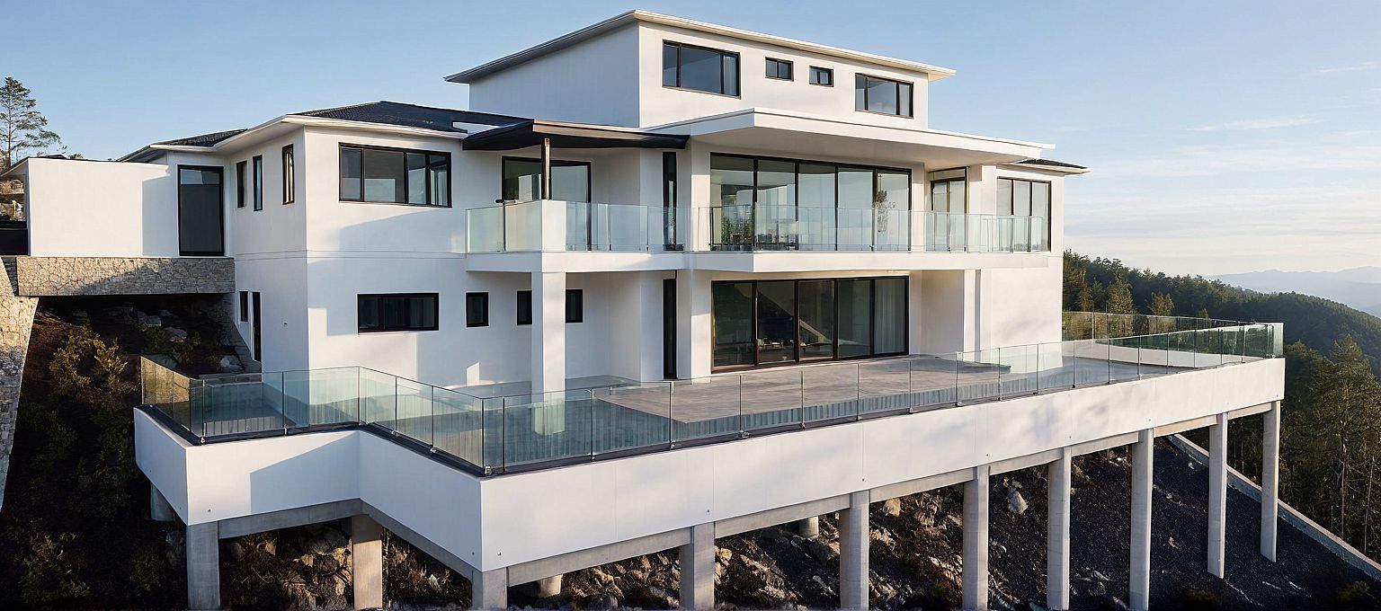 Photo of a modern residential house elevated on stilts, featuring large glass windows and a spacious balcony. Building design highlights include sleek white walls, a minimalist white roofline. Situated in a wooded mountain landscape, the environment is tranquil. Soft natural lighting brings out the textures of the materials, with delicate shadows cast by the railing. Captured from a slightly elevated angle using a wide-angle lens to emphasize the elevation and modern aesthetics of the design.