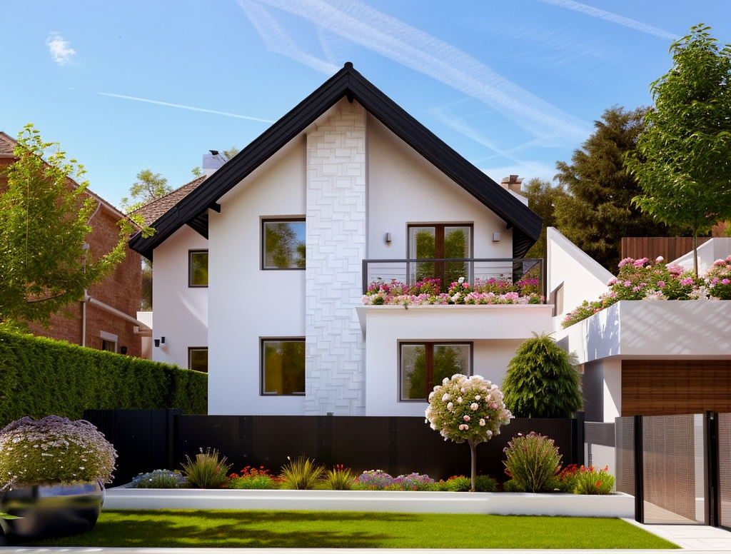Promptblack roof, light brown window, white facade, new small trees and flowers in garden,