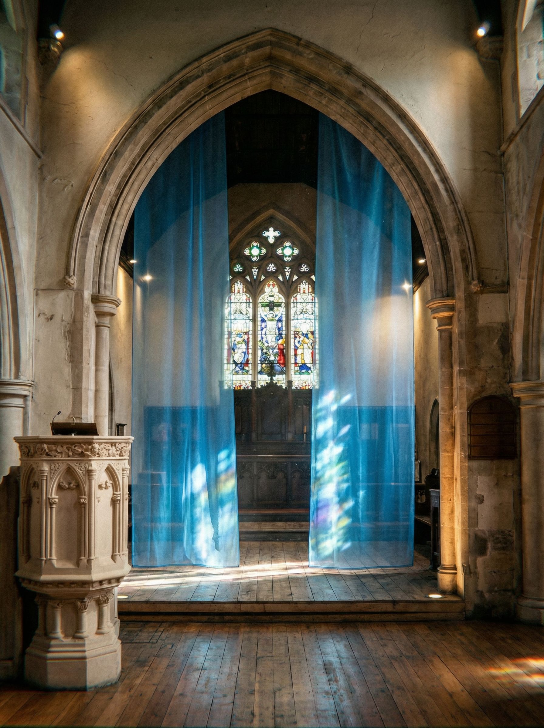 PromptAtmospheric lighting. Use reference 1 for existing stained glass windows and textures of existing walls. Use reference 2 for pulpit detail.