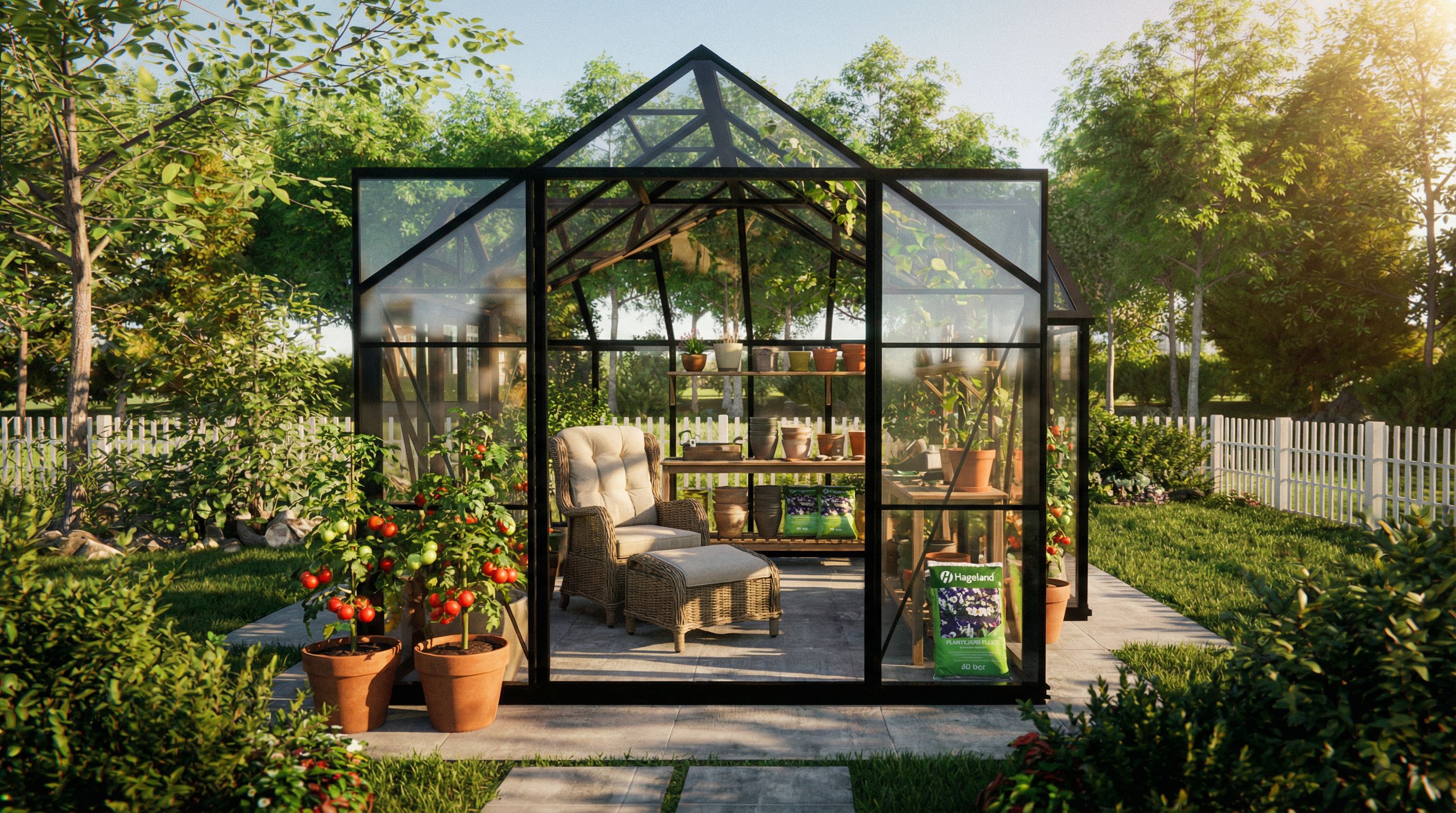 Can you optimize this visualization of a greenhouse so that it looks more realistic - both outside and inside? Make it in landscape view not portrait. I would like to two terracotta pots with tomato plants inside the greenhouse. One chairs like the ones in reference. You can also add shelves with pots and soil as in the reference pictures. No pots with plants in front of greenhouse.