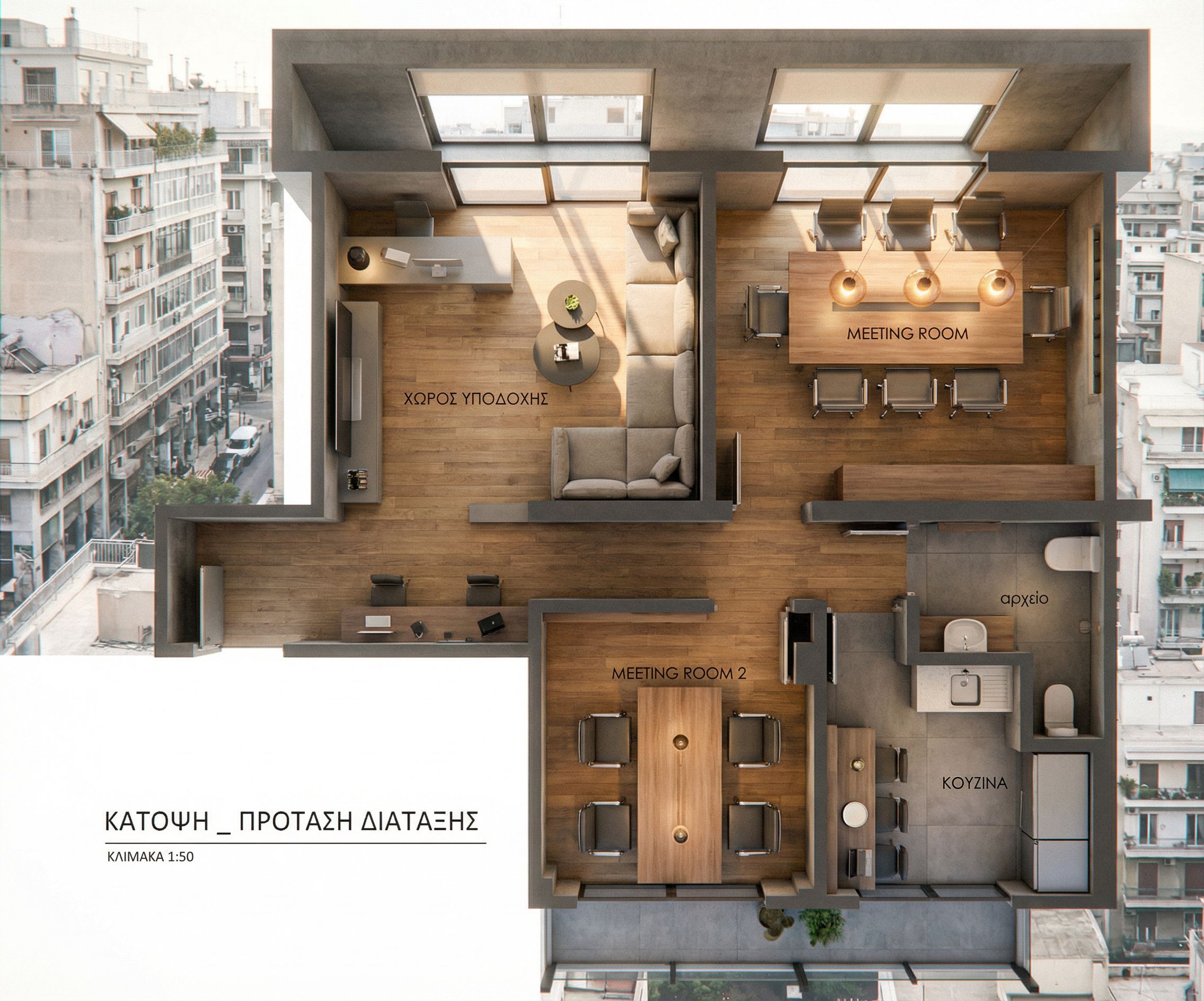 PromptPhoto of a modern office layout featuring a central meeting room flanked by two additional meeting spaces, a living area, and a kitchen. The design incorporates sleek furniture, large windows for natural light, and a minimalist aesthetic. The setting is urban, with nearby structures visible through the glass. The lighting is bright, emphasizing the warm colors of the materials. Captured from an overhead perspective, the layout is framed to highlight the flow of the space and the functional arrangement of elements, showcasing the harmony between office and collaborative areas., keep exact camera angle