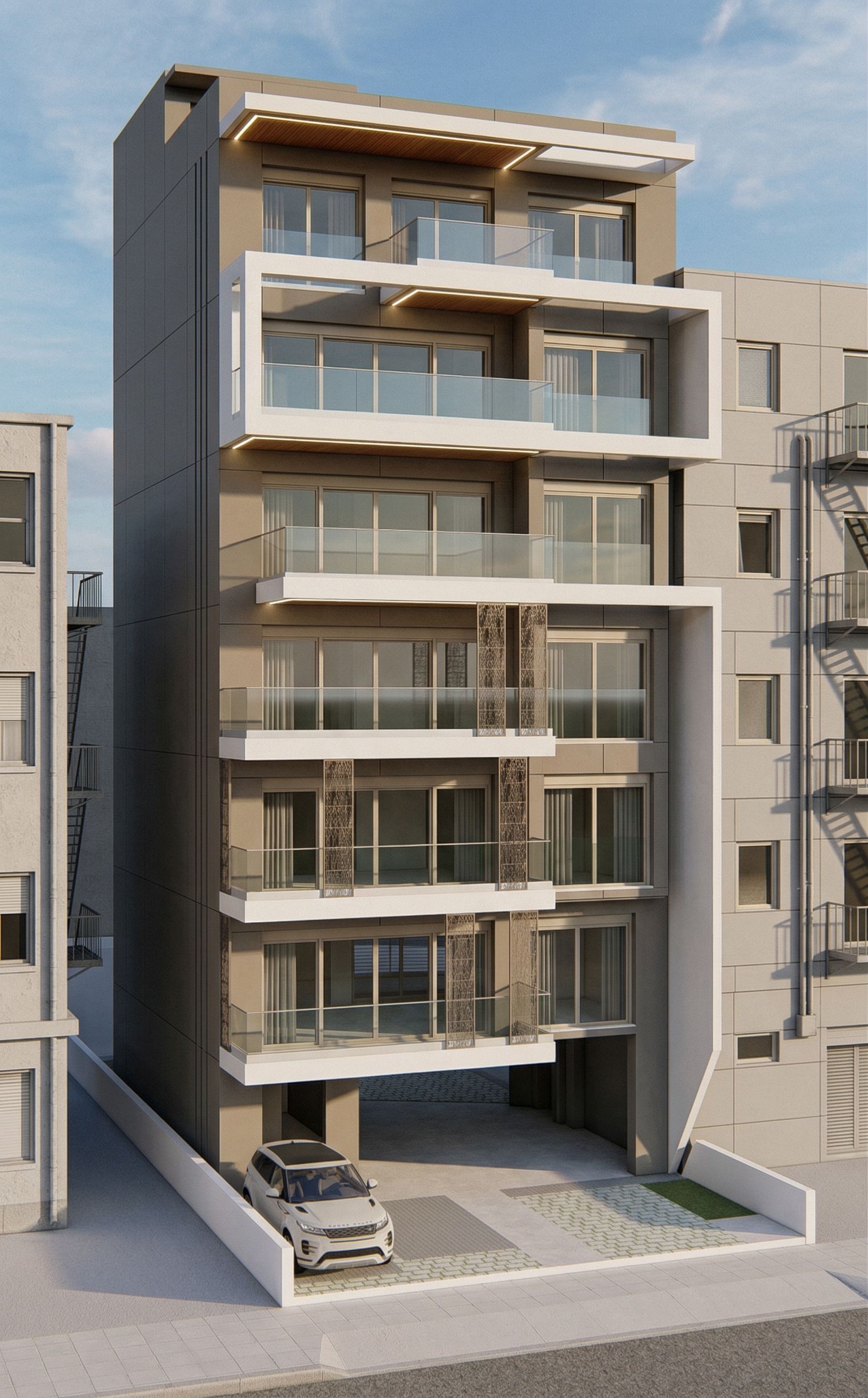 PromptPhoto of a modern apartment building featuring sleek lines and contemporary balconies. Emphasize , expansive glass windows, and wooden tops of balcony accents. Capture natural sunlight enhancing the architectural details, with soft shadows cast by the balconies. Basic color ral 7006 and some beige details with white balconies. Dont change the building. No trees .Do light grey the right and left box. Grammical white Light in the wooden balcony, keep exact camera angle, white balconies, keep exact camera angle