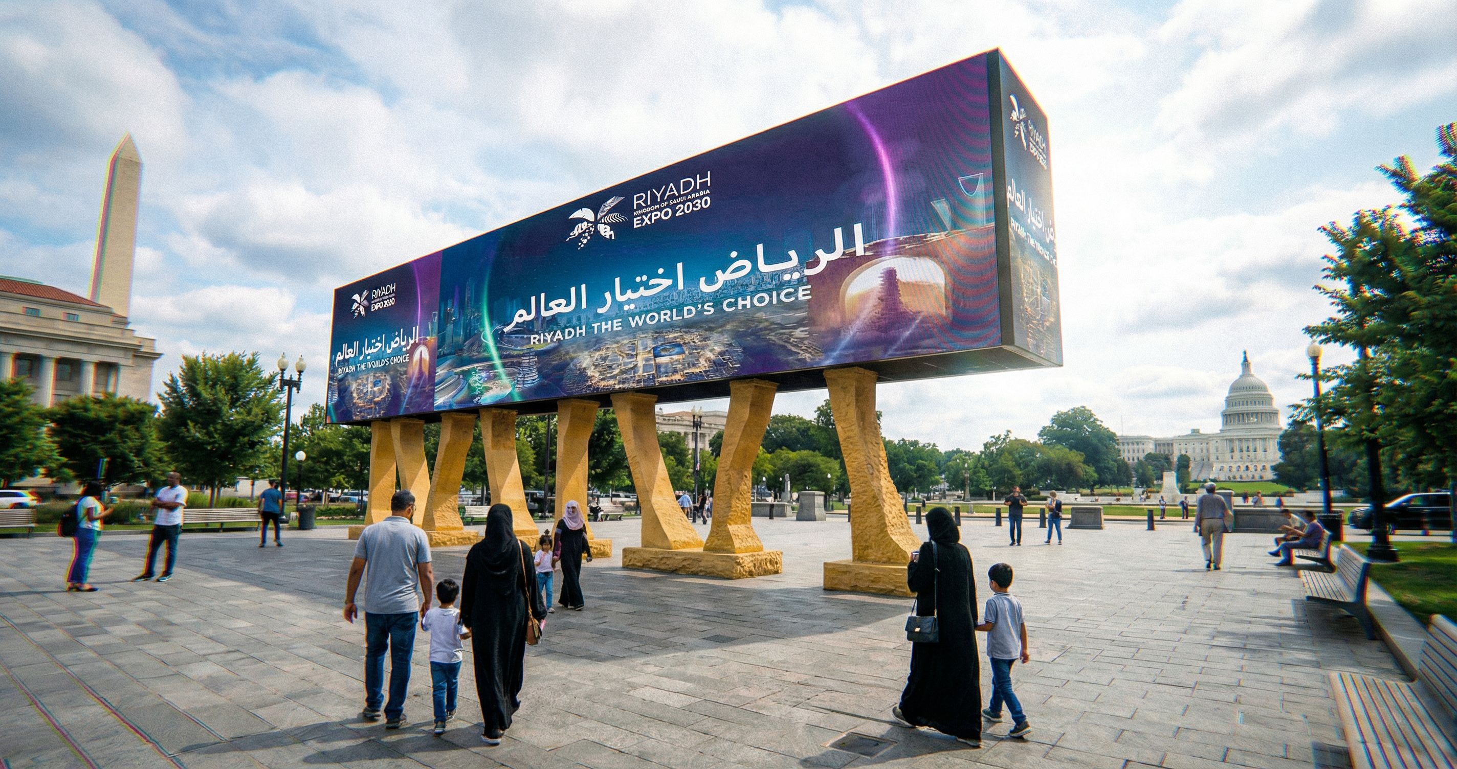 Promptput reference image on screen ,American muslims families walking around back side no appear ladies faces , keep exact camera angle , , keep exact camera angle