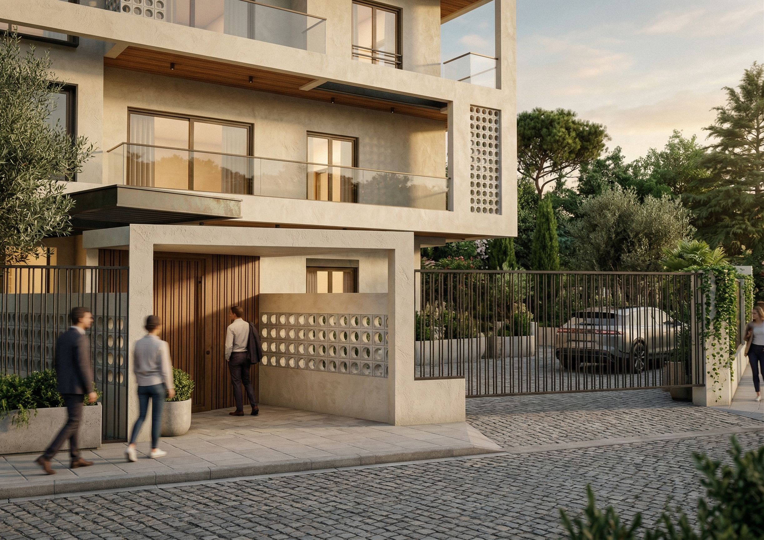 Modern block with large bronze windows, materials such as ,vanilla plaster,metal, Cement Breeze Blocks surrounded with greenery. , keep exact camera angle