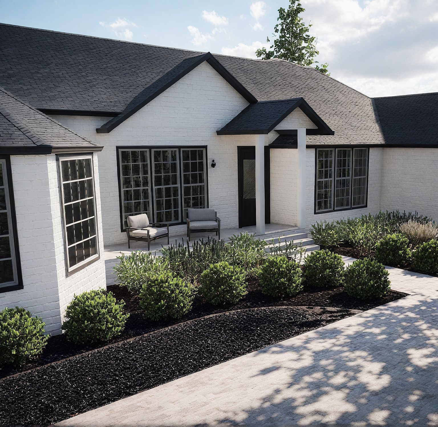 Make this photo realistic, white brick, black mulch