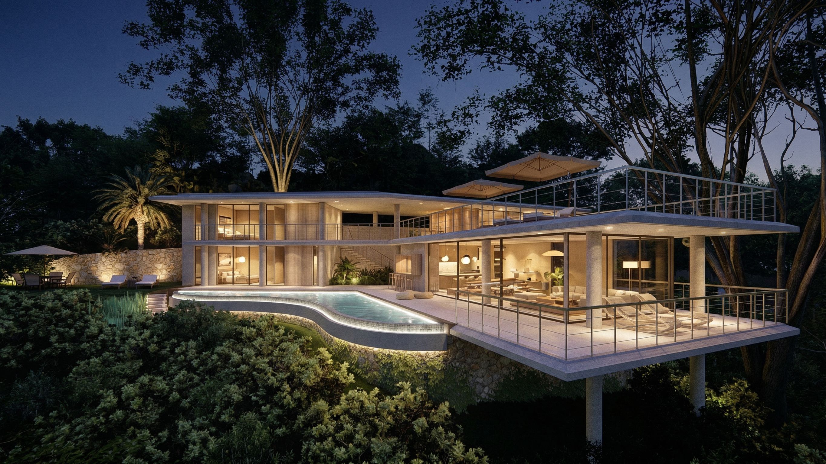 modern beach house, night view. lighting, keep exact camera angle
