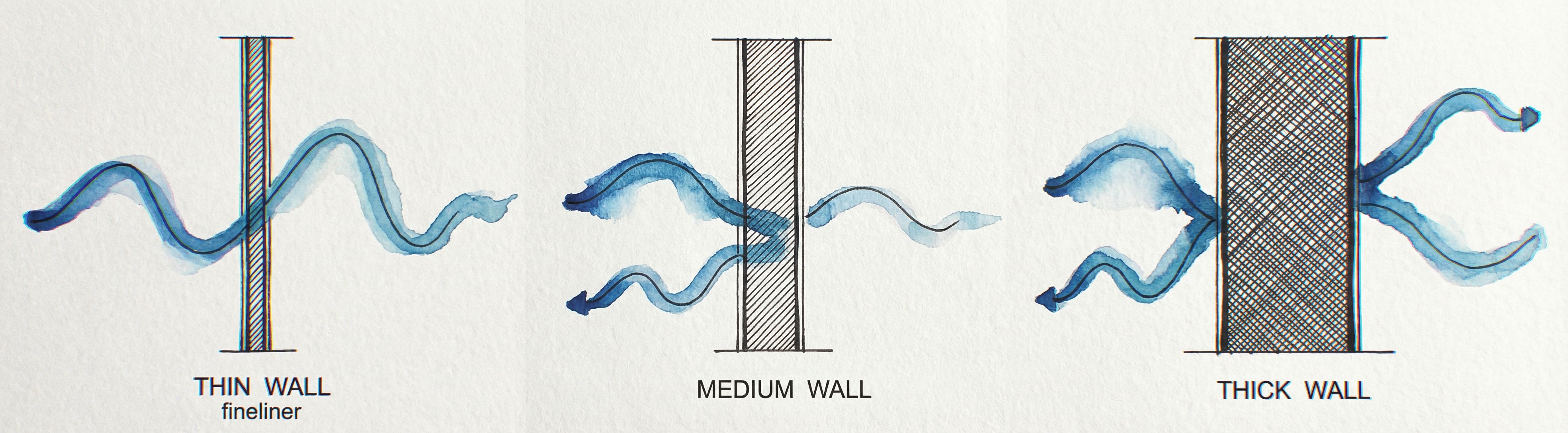 make as 3 sperate illustrations of thicknesses and a blue wave of sound. thin fineliner drawing wave travel through freely, medium thickness some wave bounces back. Thick wave all bounces off. Just an illustration fineliner and watercolour , keep exact camera angle