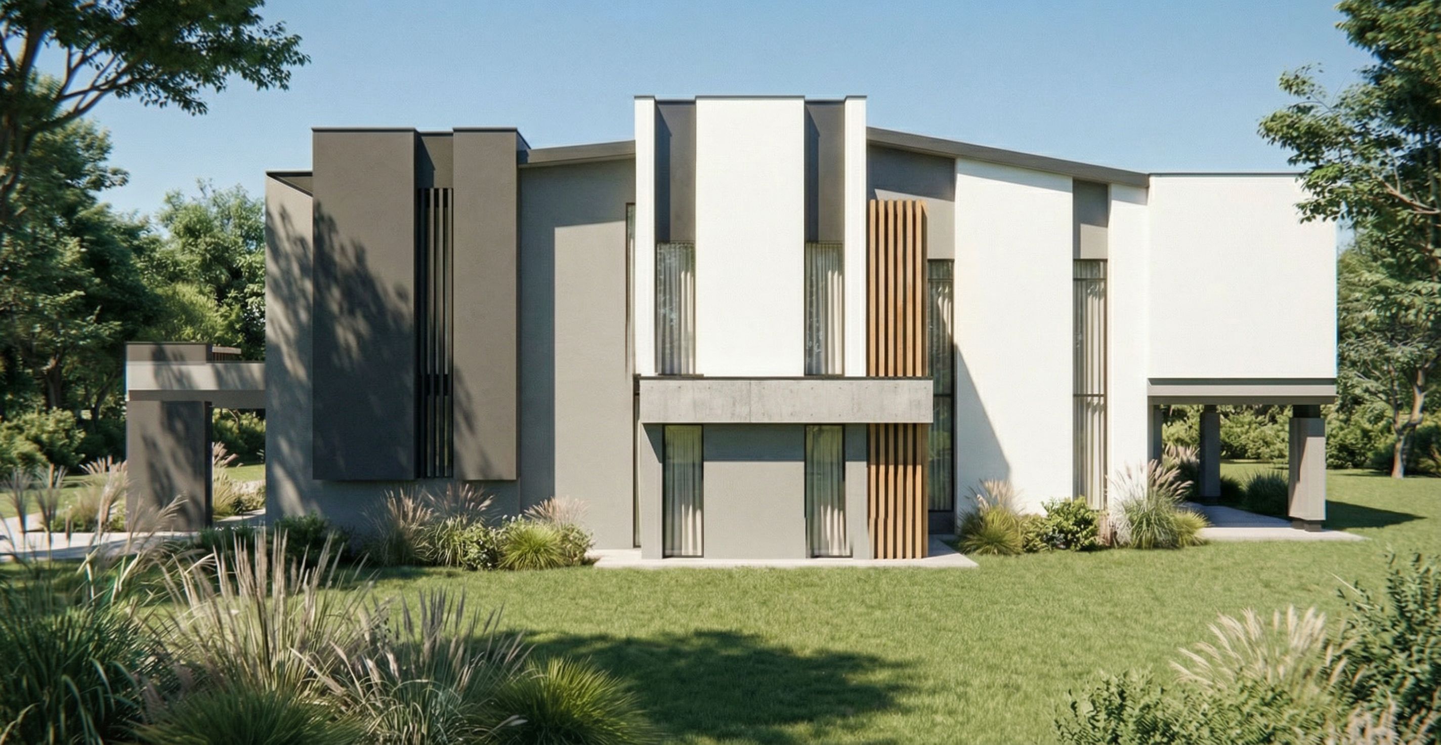 Promptmodern minimalist concrete house, two-story contemporary architecture, **right side facade of the house**, lateral right elevation view, large cantilevered roof, floor-to-ceiling glass windows with light curtains inside, dark metal accents, **vertical wooden louvers with natural wood finish**, combination of **dark gray painted surfaces, white painted surfaces and gray exposed concrete texture**, minimalist architectural composition. **Areas previously indicated in red should be finished with dark gray paint. Areas previously indicated in blue should be vertical louvers with natural wood finish. Areas previously indicated in yellow should be finished with a gray cement-like concrete texture.** No cars, no driveway, no garden pathways or stepping stones. Natural landscaping only with ornamental grasses, shrubs and trees surrounding the side of the house, clean lawn area, calm residential environment, bright daylight scene, clear sky, soft natural sunlight, realistic shadows, architectural photography style, ultra realistic materials, global illumination, highly detailed textures, photorealistic architectural visualization, 8k render. IMPORTANT: strictly preserve the architecture from the reference image, do not redesign the building, do not change the facade layout, do not add or remove windows, volumes or structural elements, keep the exact same building shape, proportions, massing, structure and architectural composition. Maintain the original architectural design exactly as in the reference image. Only modify the surface materials as specified. Strictly follow the reference image architecture and keep the exact camera angle. , keep exact camera angle