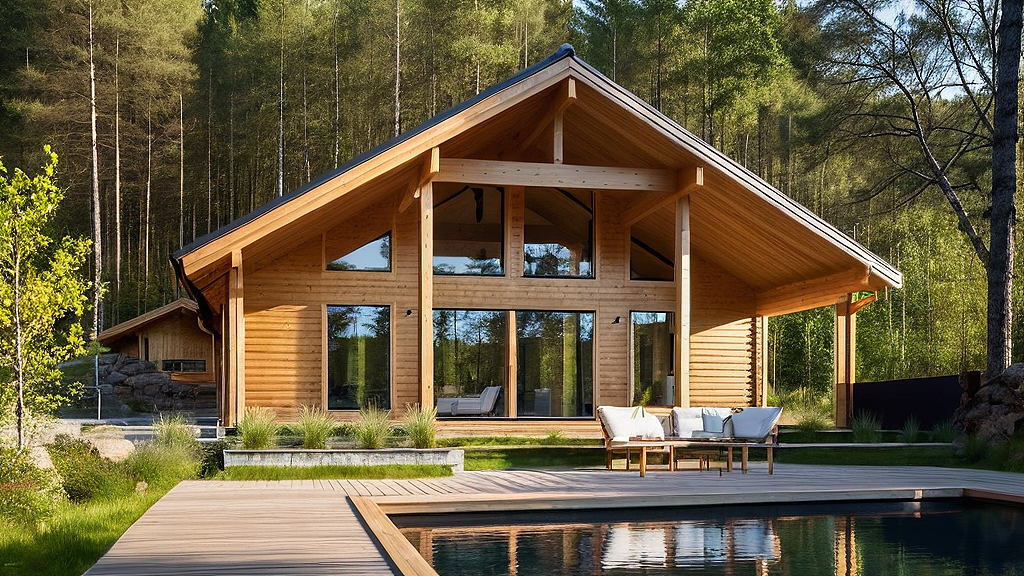 Promptbeautiful Honka wooden house exudes warmth and natural aesthetics, perfectly integrated into the surrounding landscape. Built from premium wood. Large glass surfaces allow plenty of natural light and a seamless connection to the outdoors, the spacious terrace invites relaxation. ideal for a retreat from everyday stress and a connection with nature, make me spring image with Turquoise swimming pool in front with loungers. surrounded with wood. sunset photo