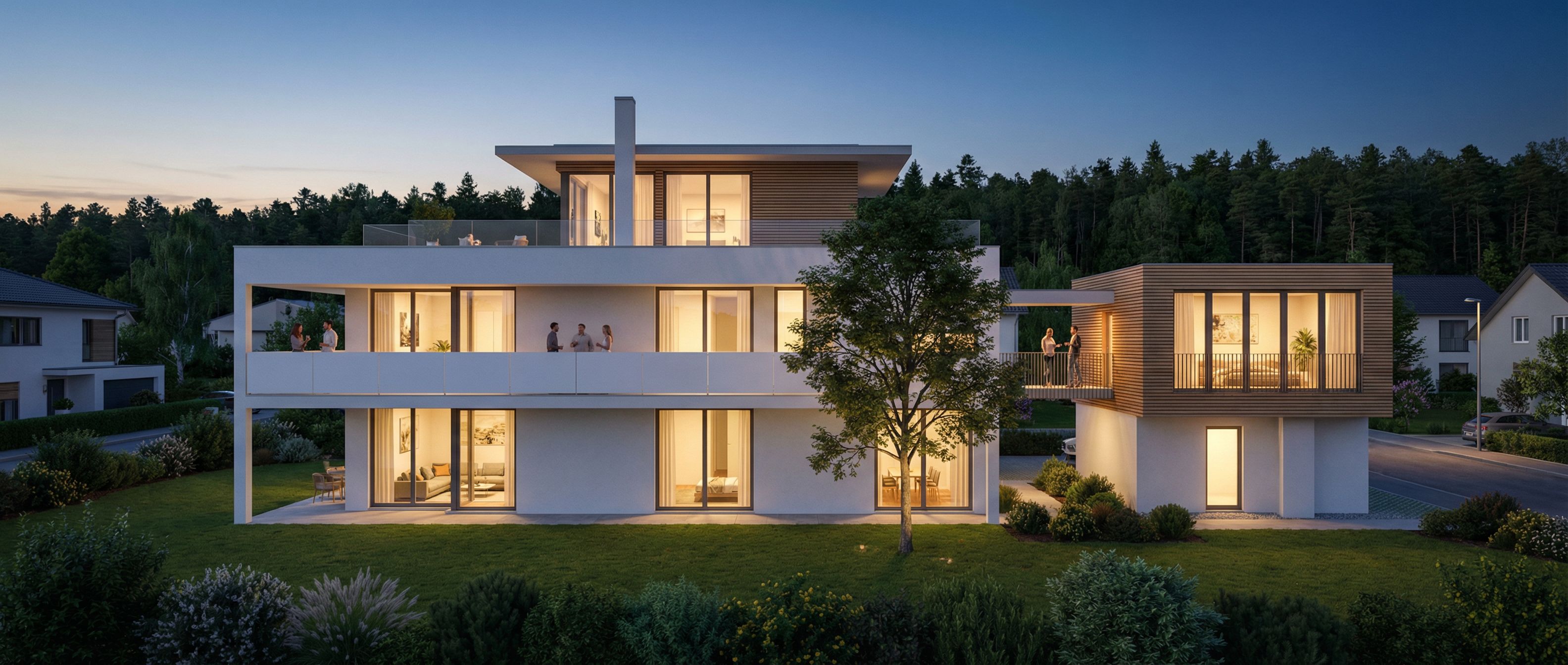 landscape architecture rendering, render this drawing into photorealistic rendering, Photo of a modern residential building featuring sleek, minimalist design elements but a white panel-reeling on the balcony in first floor, with large glass windows also on the wodden cube and horizontal wooden slats. People on the balcony, wideglasfront on the wodden cube at the right side. Set within a suburban landscape, the home is surrounded by green space and manicured lawns. Natural morning light casts soft shadows on the façade, highlighting the interplay of textures between smooth concrete and warm wood. Captured from a slightly elevated angle to emphasize the building's lines and proportions, an ultra-wide lens enhances its presence against the backdrop of a forest with large trees and the clear sky., wide establishing shot, night scene with ambient lighting, high quality, professional, detailed scene