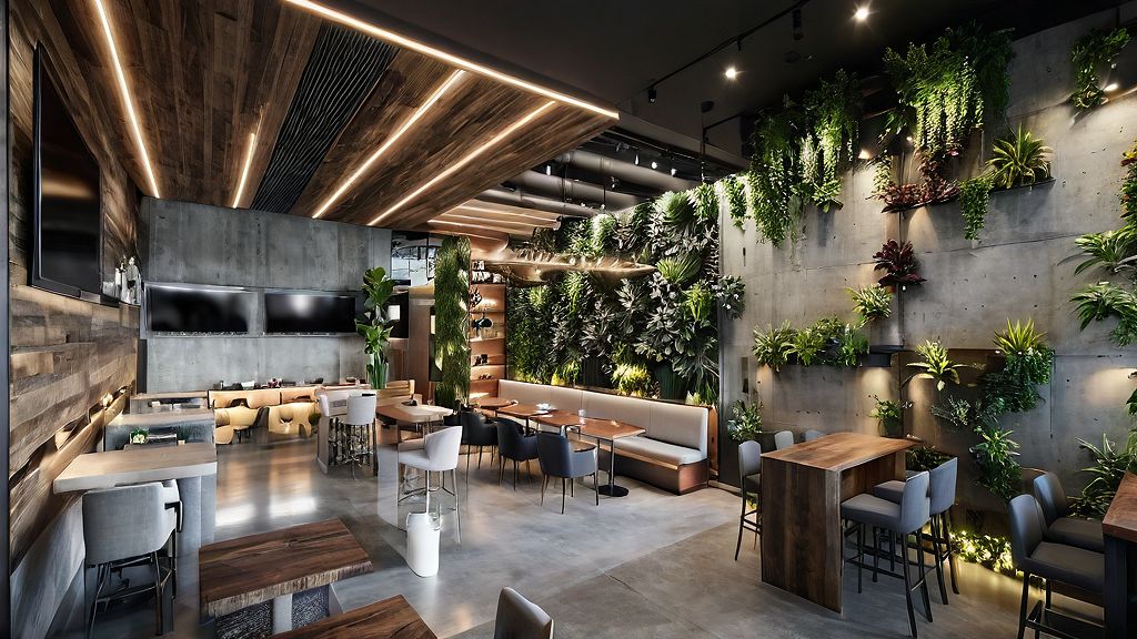 Promptconcrete walls with wood and vertical garden, metal shelves, tv, lighting, bar counter, soft seating furniture, carpet floor