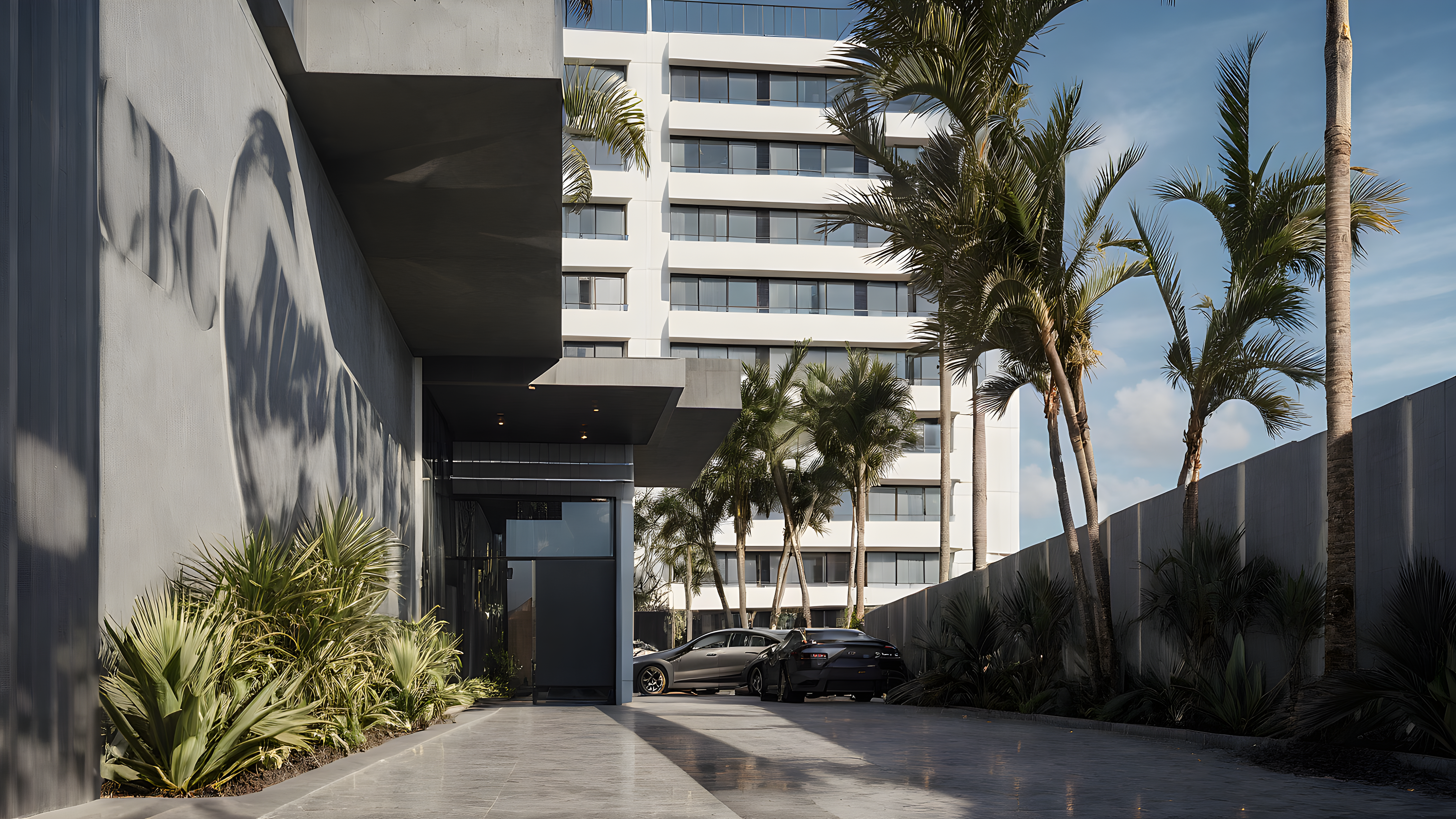 PromptWall lights on left. Gray building. Daylight. Sunny. Palm Trees. Aspalth road on right. Ceramics on left.