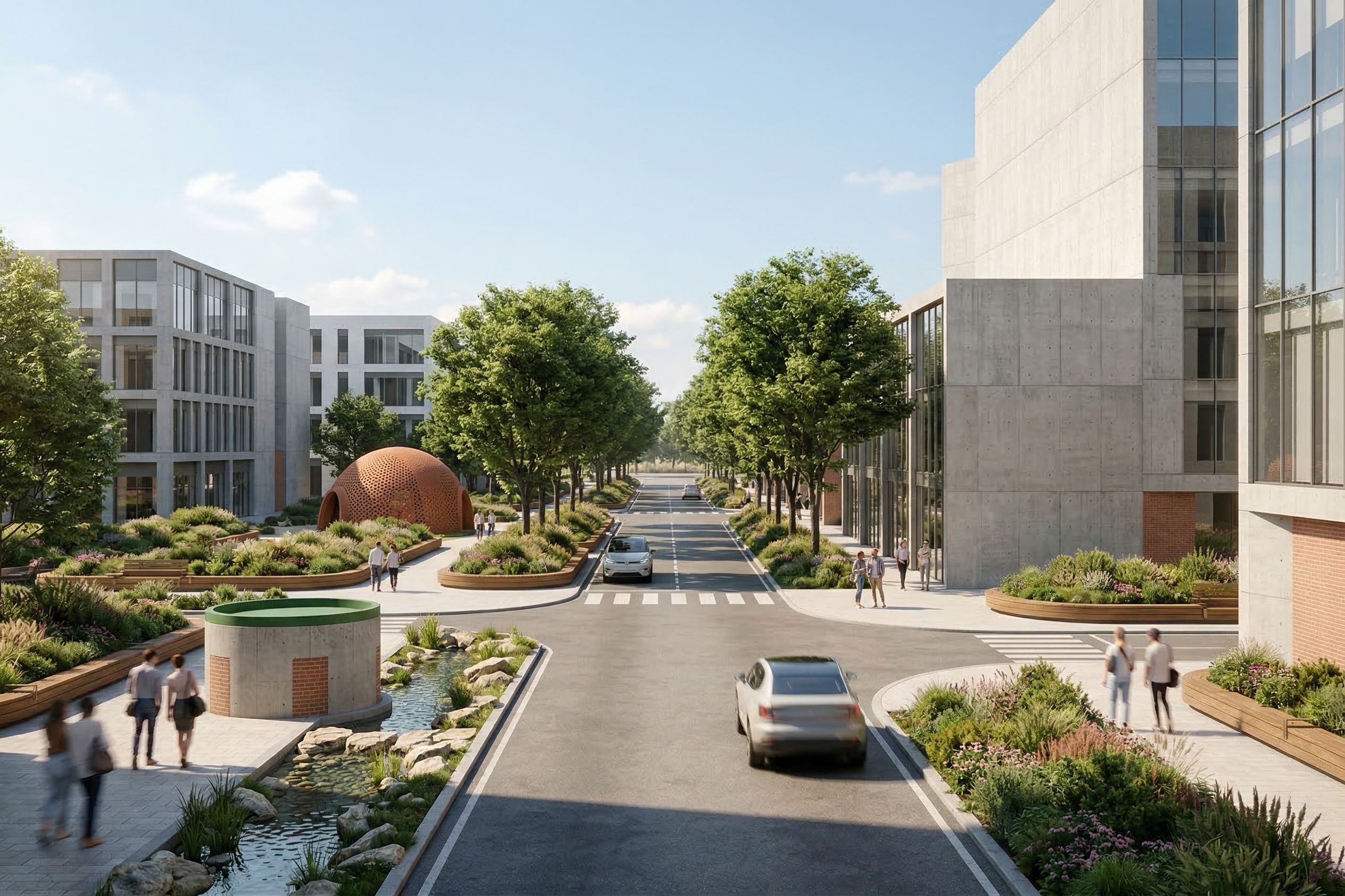 preserve original geometry exactly, do not change massing, proportions, or layout, no deformation, no added architectural elements use reference images only for mood, landscape quality, planting style, water integration, and lighting, do not copy architectural forms or geometry street-level view across an urban street connecting two sides of a contemporary architectural site, emphasizing strong visual continuity between both sides buildings use exposed concrete, large glass surfaces, and subtle terracotta brick accents, minimal and refined material palette consistent across the project introduce lush, layered landscape design inspired by the reference images, with dense planting, soft edges, and a mix of trees, shrubs, and groundcover creating a cohesive green environment on both sides of the street add integrated water elements such as shallow linear water features or soft edge water basins near the pedestrian areas, subtle and natural, enhancing the environmental quality without overpowering the space trees are aligned and intentionally placed to visually connect both sides of the street, forming a continuous green corridor effect include people walking along sidewalks and crossing the street, creating interaction and flow between both sides optionally include a few minimal, realistic cars, secondary to pedestrians sidewalks are wide and integrated with planting and seating elements, inspired by the reference images, creating moments for pause and gathering lighting is warm daylight with soft natural shadows, creating a welcoming and calm atmosphere overall mood is cohesive, serene, and connected — the street becomes part of the experience rather than a barrier landscape design visually overlaps across the street, creating a continuous ecological and spatial experience Keep the geometry given It is not an intersection, is two blocks with only one street in the middle