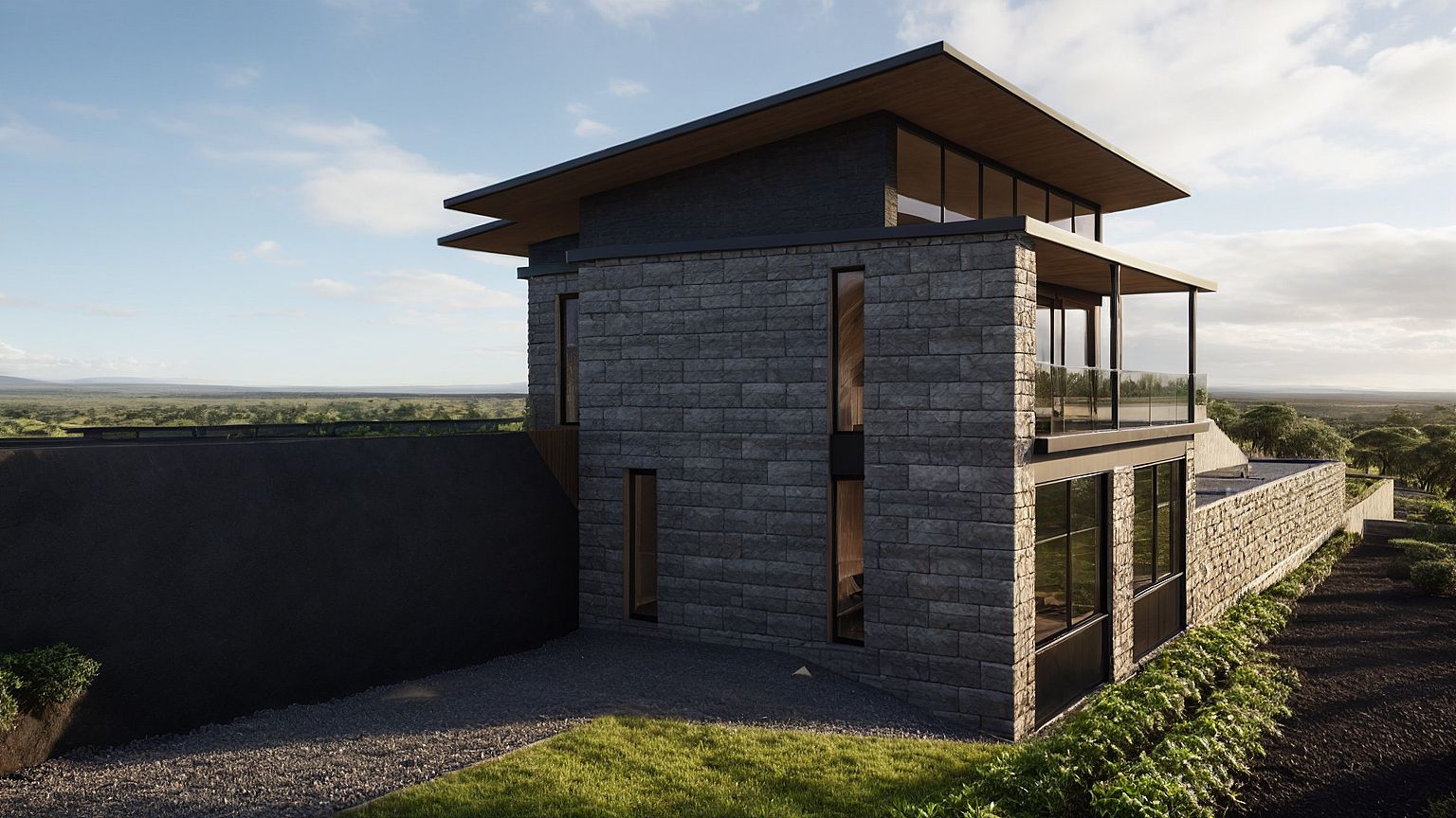 PromptRender the exterior of a modern villa with large windows that invite abundant natural light. The design should showcase a harmonious blend of sleek lines, natural textures like wood and volcanic stone, and elegant architectural detailing. Capture the villa in soft morning light, with gentle shadows enhancing the facade. Use a wide-angle perspective to frame the surrounding lush landscape of the Great Rift Valley in Naivasha, Kenya, adding depth and a sense of place, HD and photorealistic, add texture and depth, make sure the black area is sky in Naivasha great rift valley