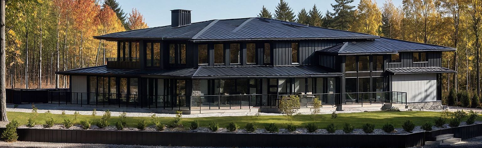 Black standing seam roof, grey vertical board and baton, black window trim,, sunny day trees and sunlight in windows