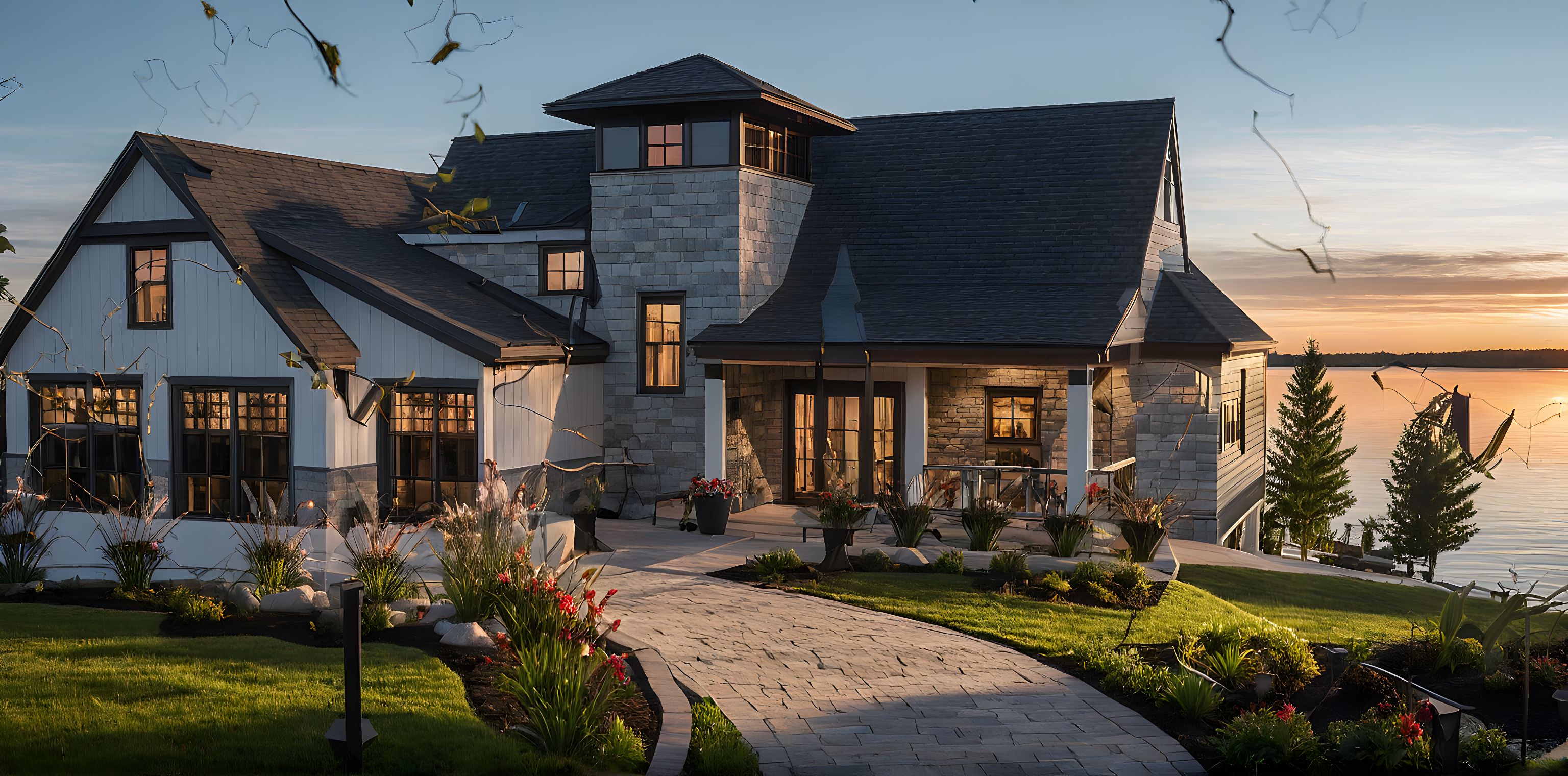 PromptPhoto of a modern residential lake house featuring a combination of white and grey color scheme , with a prominent gabled roof. The design incorporates large windows and a welcoming front porch framed by tall, midwest landscaping and colorful flower pots. Set against a serene lakeside backdrop, the urban landscape includes gently rolling terrain and other residential structures in the distance. Soft, warm sunlight casts gentle shadows across the façade, enhancing textures. Captured from a low-angle perspective with a wide lens, highlighting the home's height and inviting atmosphere. Dusk shot with glowing light in windows