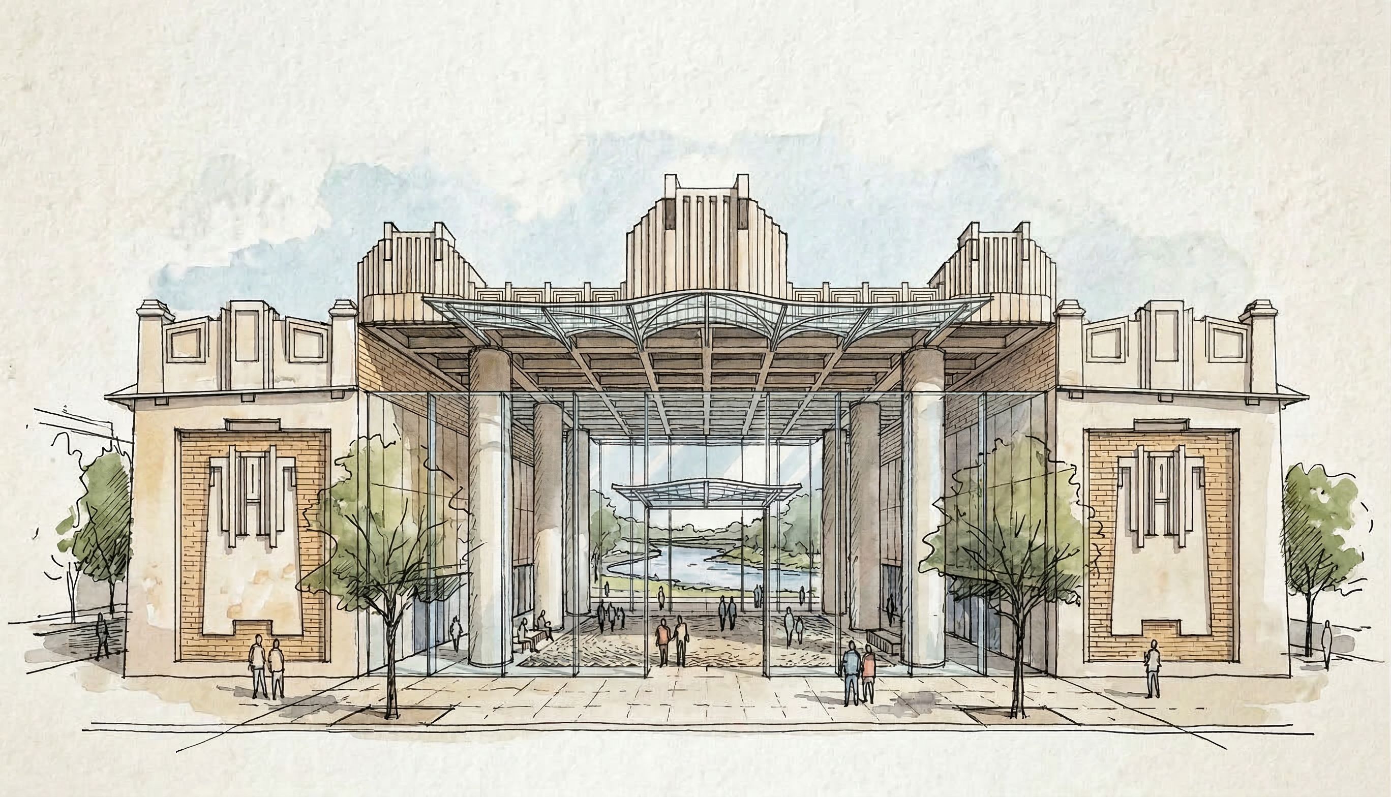 PromptApply changes ONLY within the area marked by red lines. Do not modify anything outside this marked zone. Intervention Create a light, transparent glass entrance layer placed in front of the façade. The glass structure is slightly offset in front of the building (1–2 meters) Keep the original brick façade fully visible behind it The intervention must be subtle and limited in size Entrance design Use full-height glass panels (minimal framing) The entrance should feel light, transparent and reversible No heavy frames, no massive elements Spatial effect Create a small covered threshold space between glass and façade The entrance should visually connect interior space with the river beyond Roof connection The flowing roof above should slightly lower or open in this zone, emphasizing the entrance The glass layer should visually connect to the roof canopy Style hand-drawn architectural sketch loose tablet drawing ink lines with light watercolor visible sketch strokes Important modify only inside the red-marked area keep the rest of the building unchanged no text no labels no annotations, keep exact camera angle