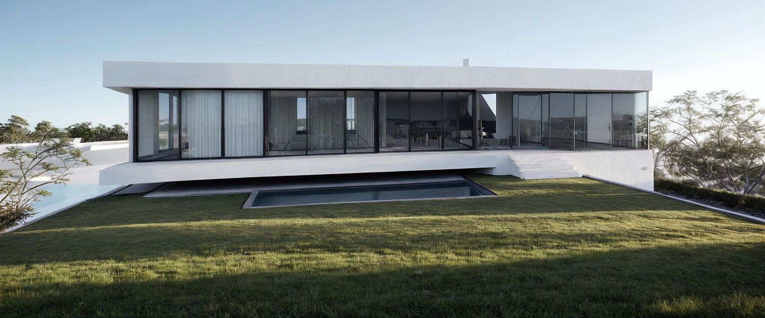 PromptExterior. linear one level building with white horizontal cladding and floor to ceiling glass all the way along the front. Vertical screening on right hand side with open alfresco area with pool