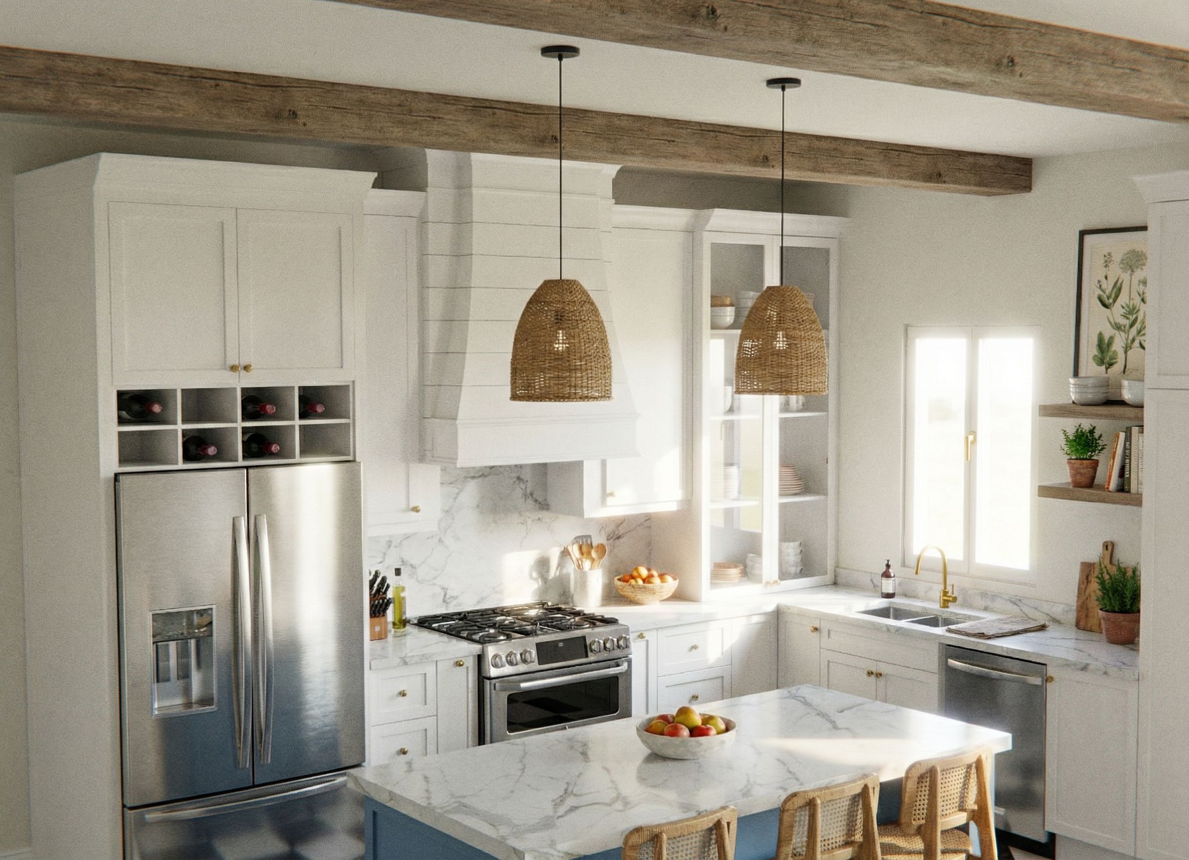 Promptwhite cabinets, checkered floor, wood beams, woven basket lighting, marble countertops, shiplap range hood, blue island, bright sun light pouring into the room, nice decorations, no shadows, full sun, , keep exact camera angle