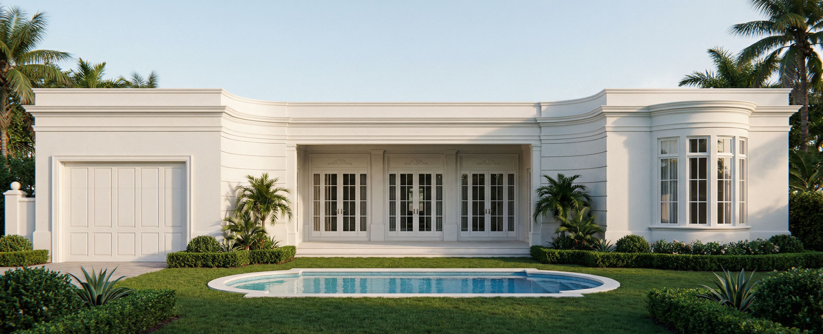 Ultra-photorealistic perspective elevation rendering of a Neo-Classical Regency Palm Beach rear façade using the provided line drawing as a fixed architectural blueprint. The drawing defines the exact proportions, heights, widths, alignments, spacing, and massing relationships and must be followed precisely. Do not redesign, reinterpret, stretch, compress, or rebalance the composition. Preserve all architectural elements exactly as drawn. The façade is composed of three primary parts with a strict depth hierarchy: the central loggia is the furthest back element, the doors within the loggia are recessed even further behind the columns, and the two flanking wings, the garage wing and bedroom wing, sit forward of the loggia and align with each other. These offsets must remain clearly visible in perspective and must not be flattened or exaggerated. The wall sections adjacent to the loggia with the horizontal lined detailing are true curved concave transition walls, not flat walls, and they must read clearly as curved surfaces creating a soft transition between the wings and the recessed center loggia. The bedroom wing contains a true semi-circular projecting bay window that must read clearly as a bay window, not a flat wall. The bay must project outward from the main wall plane with visible depth, continuous smooth curvature, and a clear shadow break where it meets the wall. Its proportions must be historically appropriate to Regency architecture: elegant, restrained, secondary to the central loggia, moderately projecting, and slightly lower and more horizontally proportioned so it sits comfortably below the entablature rather than pressing into it. The bay should feel integrated with the wing and proportionate to the overall composition, not oversized, bulky, or tower-like. The architecture should have refined Regency character with disciplined symmetry, crisp classical lines, shallow relief, and elegant restraint, with no heavy ornament and nothing overly ornate. All exterior walls are smooth white stucco with a clean refined finish, not limewashed and not heavily textured. Trim is also white with subtle tonal variation only through light and shadow. Keep the detailing crisp and classical. The rear garden includes an oval pool centered on the loggia axis, with its long side running parallel to the façade and visible in the foreground. The pool must remain modest in scale and secondary to the architecture, used mainly for placement and composition, never oversized or overpowering. Landscape the setting as a refined Palm Beach rear garden with symmetrical organization, clipped hedges, soft lawn, and restrained tropical planting that supports the architecture without distracting from it. Use soft warm afternoon light with gentle shadows that reveal the recessed loggia, curved transition walls, and the projection of the bay window. Render as a perspective elevation, not a dramatic perspective and not a flat orthographic elevation: a lightly angled, controlled architectural view with minimal distortion, slightly elevated or eye-level, using a lens that preserves the drawing’s proportions while still showing the depth relationships clearly. The overall image should feel elegant, calm, highly realistic, and architecturally precise. Do not flatten the façade, do not alter proportions, do not modernize, do not add ornament, do not make the pool too large, do not turn the curved walls into straight planes, and do not make the bay window too tall, too deep, too wide, or too visually dominant. The doors have a solid transom panel with a refined simple regency style plaster work motif. , keep exact camera angle