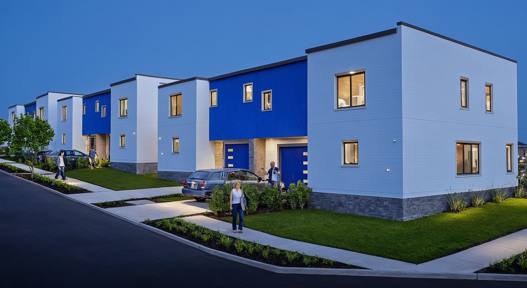 PromptDusk shot. Sunlight in windows. Photo of modern townhouses featuring clean lines and flat roofs, with a combination of white siding and dark accents. Highlight textured materials, large windows, and vertical elements. Cement driveways and sidewalks. Set in an urban residential environment with nearby green landscaping and pedestrians enjoying the area. DUSK SHOT. Captured from a low angle with a wide lens, emphasizing the architectural features and inviting atmosphere of community living.