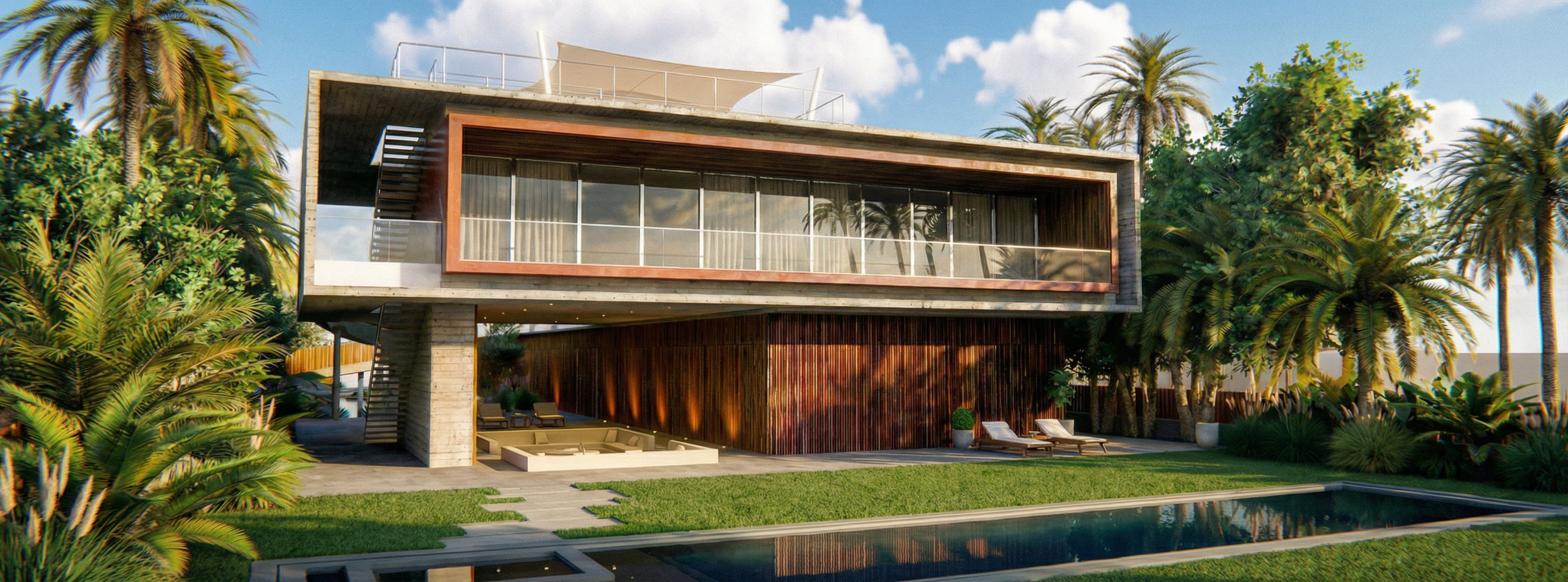 Prompt Añade los sillones igual que están en la imagen de referencia. Genera un cielo soleado con algunas nubes blancas bien marcadas de un día de verano., keep exact camera angle