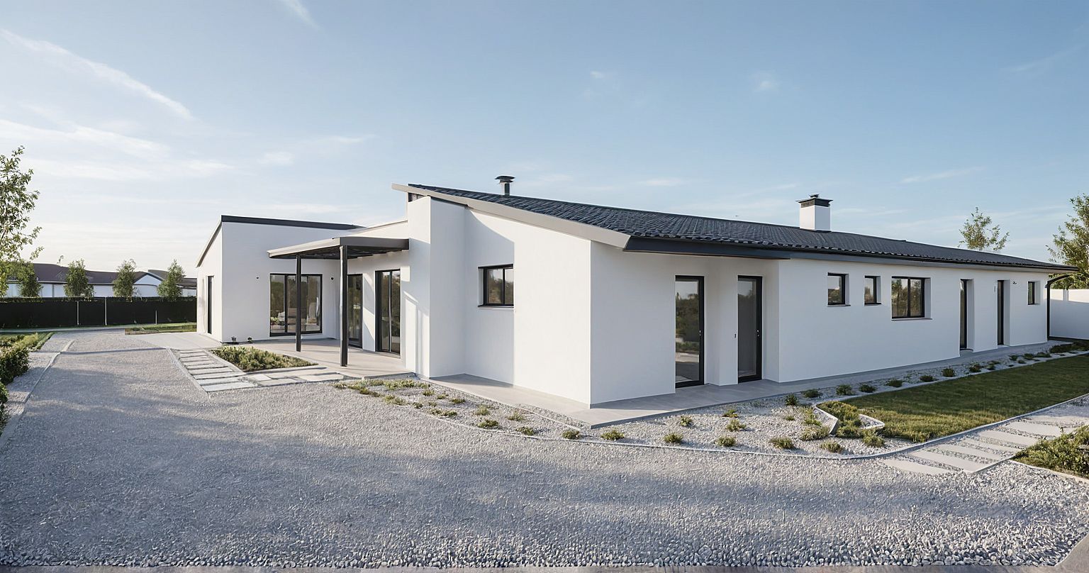 PromptModern house with smooth plastered and painted white walls, metaled pergola at entrance, double carport and driveway, simple mono pitched roofs, in a populated neighborhood.