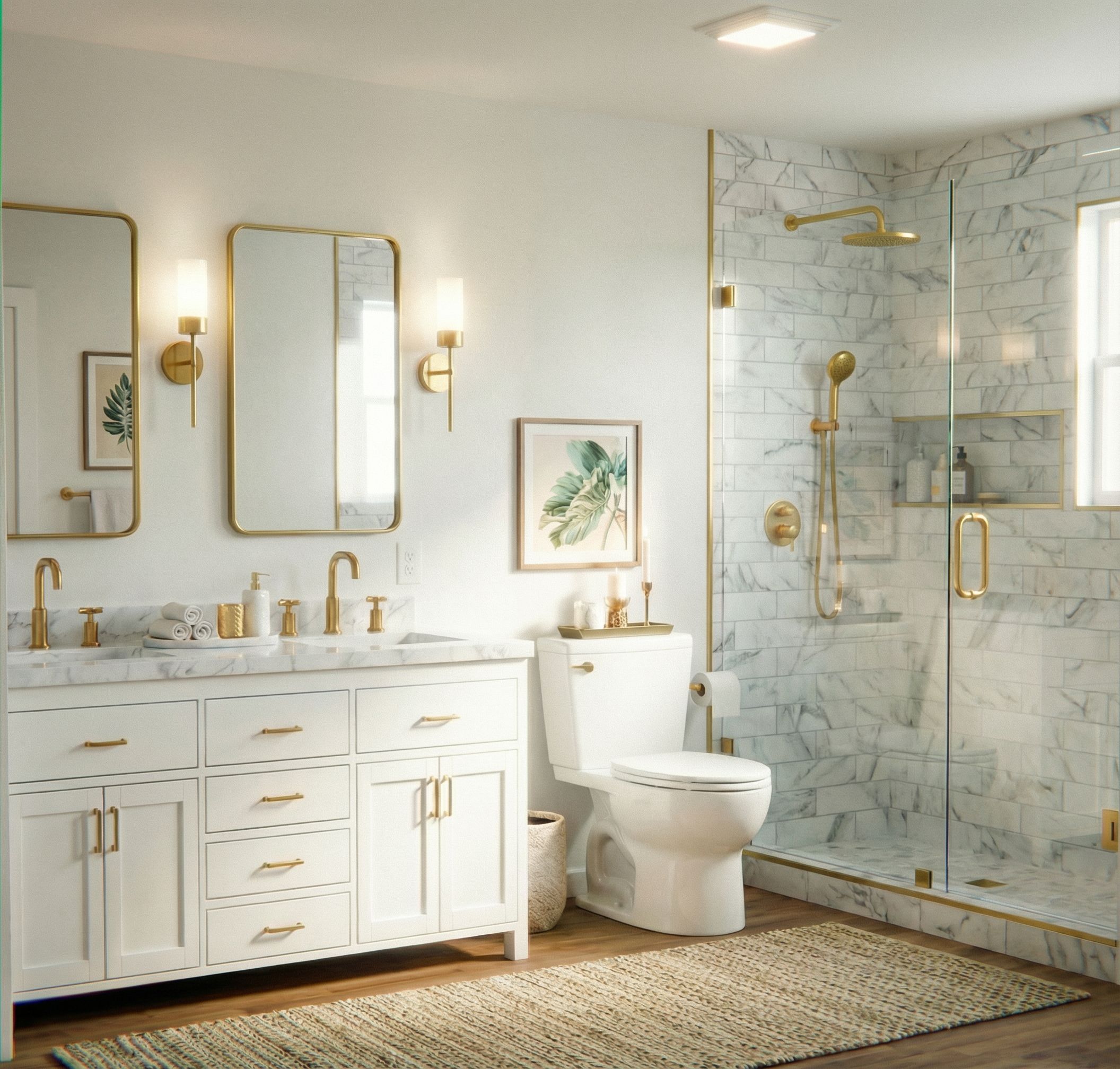 PromptChange the fixtures to brass, the shower to marble subway tile, one photo above the toilet, keep exact camera angle