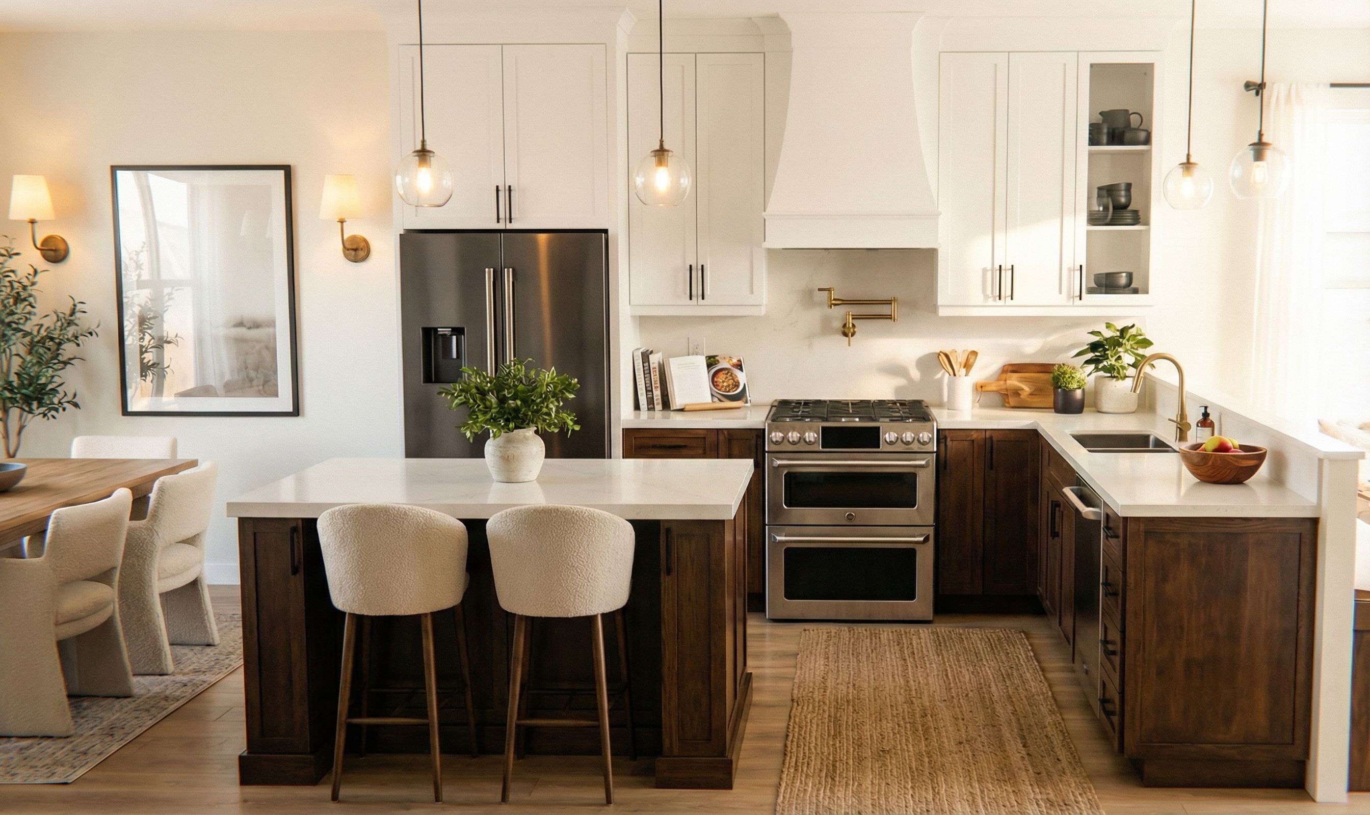 PromptREMOVE THE COUCHES INFRONT OF THE ISLAND AREA, KEEP THE STOOLS AND DINING CHAIRS AND TABLE, keep exact camera angle