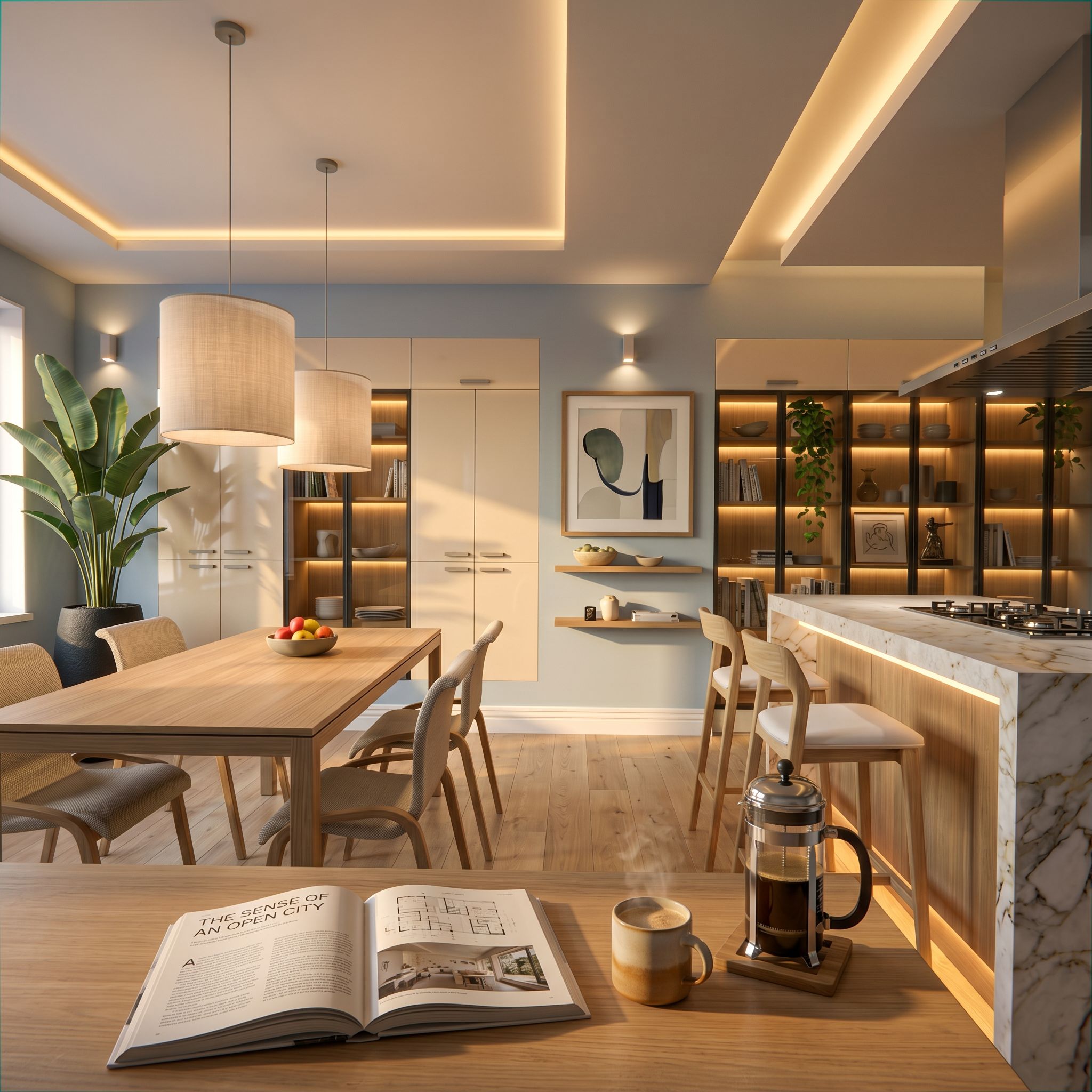 PromptAñade a cada una de las estanterías abiertas dos puertas de cristal ahumado pero transparente y con un bastidor metálico fino de color negro y deja las luces encendidas por dentro. Elimina la planta de la izquierda y pon una planta y un macetero más bonitos Añade pequeñas obras de arte en algunos estantes. Elimina los objetos que están sobre la mesa y pon un libro de arquitectura abierto y una taza de café con leche humeante y una cafetera tipo sueca. Añade más libros en las estanterías. Añade luz lineal bajo la barra de la cocina justo debajo de la encimera. añade un foso en el techo que toca la pared del frente para poner luz lineal sólo en esa parte del techo., keep exact camera angle